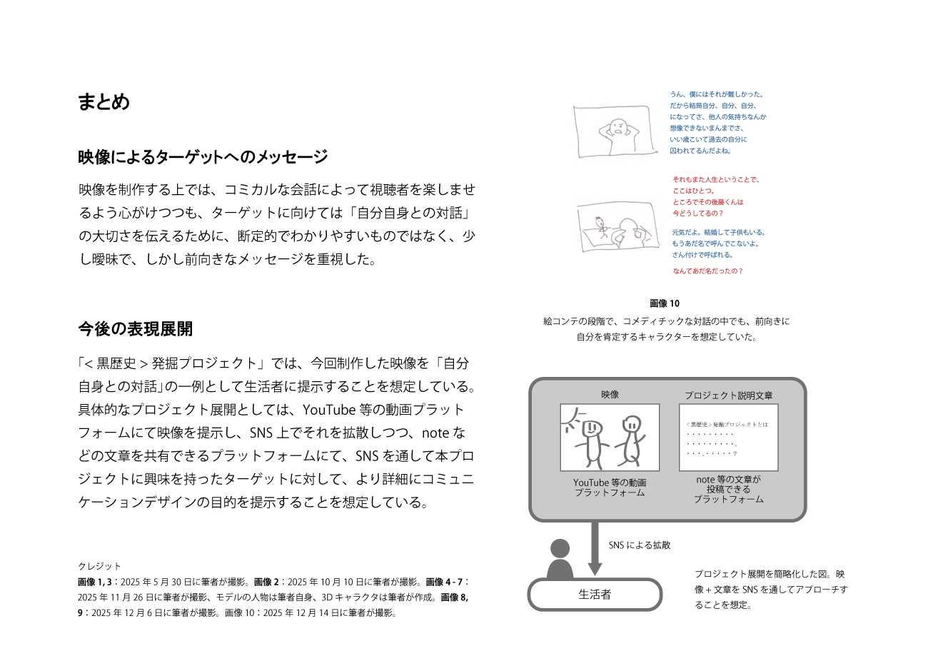 プロジェクトの一環として、過去の自分自身との対話をテーマとして映像を制作した。登場する 3Dキャラクターは、筆者自身の過去の落書きをモチーフにデザインした。 本動画は対話のプロセスの一例として、背景や課題も含めて SNS上で公開することを想定している。それによって、自らの「恥ずかしい」過去にも、あえて触れることで得られる気付きもあると生活者に対して例示し、自分自身の再確認をカジュアルに行える意識を醸成することを企図した。