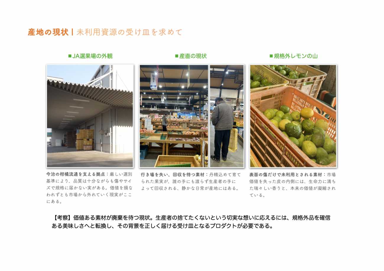 JA選果場や直売所の実態を調査。徹底した品質管理の裏で、味は最高でも傷があるだけで活用が難しくなるもったいない現状に直面しました。現場の声を聴き、未利用資源を新たな価値へ変える解決策を模索しました。