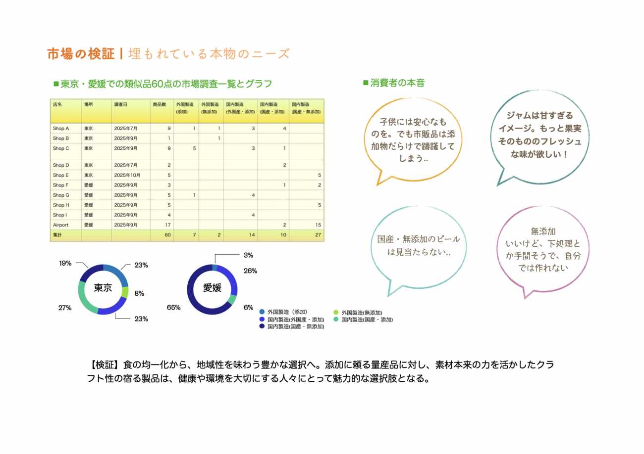 市場調査から、無添加で地域性・クラフト性のある製品の希少性を確認。安心・安全へのニーズと、素材本来の味を求める潜在的な欲求に応えることが、新たな価値創造に繋がると確信しました。