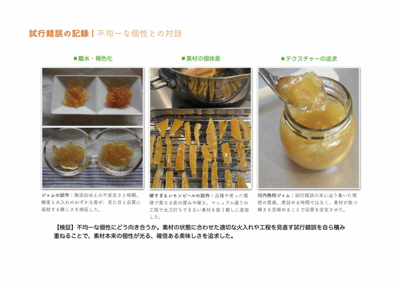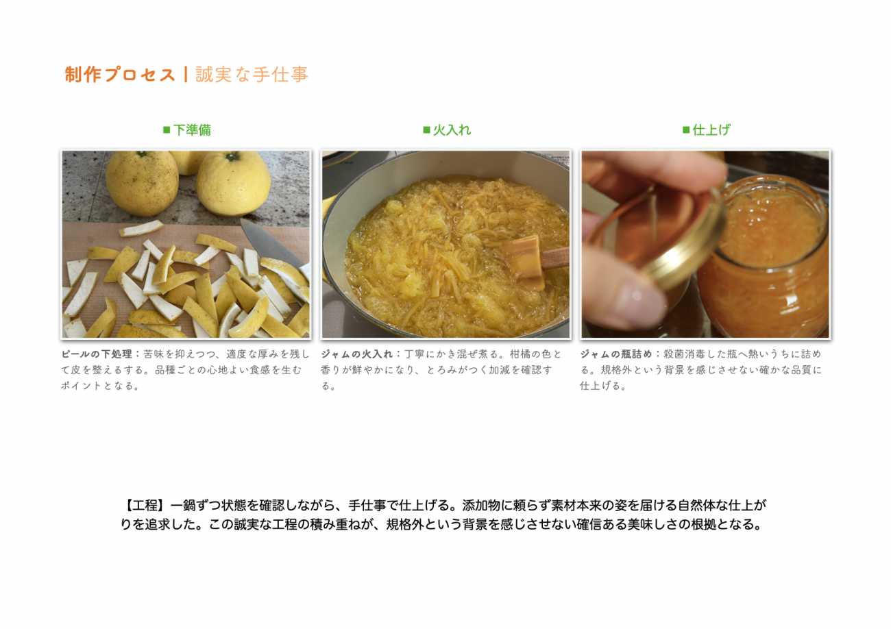完成したのは、柑橘の命を凝縮したジャムとピール。丁寧な手仕事を経て辿り着いた透明感と鮮やかな香りは、素材の力そのものです。今治の豊かな恵みを、無添加で確信ある美味しさとして届けることを追求しました。