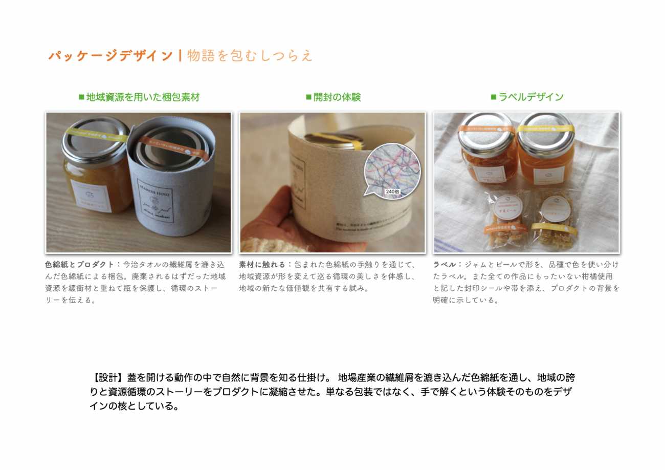 地場産業である今治タオルの製造過程で出る繊維屑を漉き込んだ色綿紙による梱包や、物語を伝える媒体(フライヤー)を通して、作品に今治の誇りと資源循環のストーリーを凝縮させています。また、蓋やパッケージを開ける動作の中で、封印シールや帯に記された背景に自然と触れる仕掛けを施し、持続可能な農業や食糧生産に貢献しながら、地域の食を楽しみ、味わう生活の豊かさを感じてもらうきっかけをデザインしました。