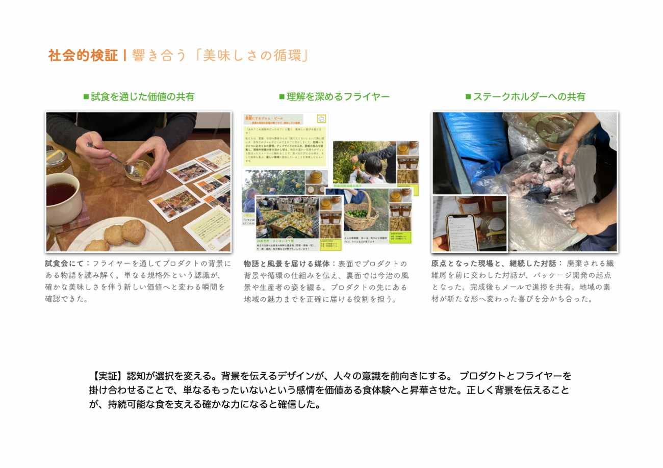 調査では、品質が同じなら規格外品も購入するという人が7割を超えています。試食会を通じ、その期待を「感動」へ変える鍵はデザインにあると実証。人々の豊かな食の選択を支える一助になると確信しています。