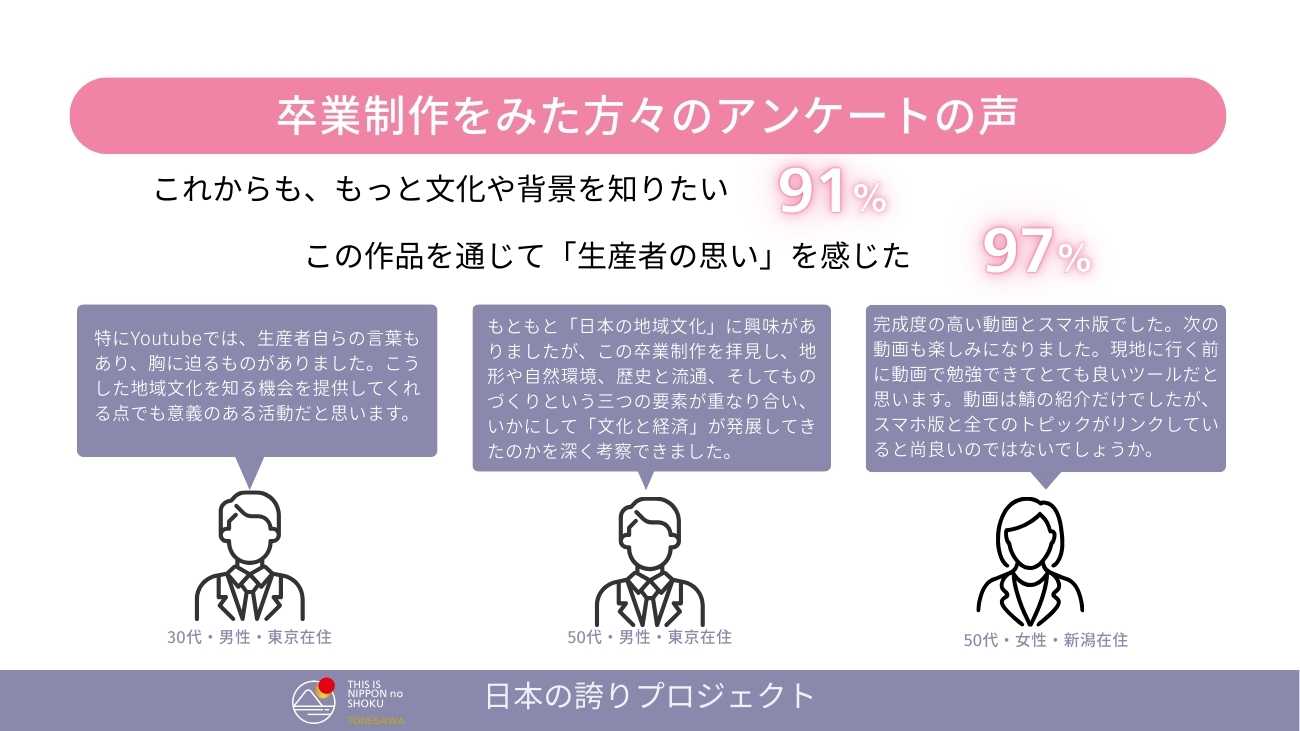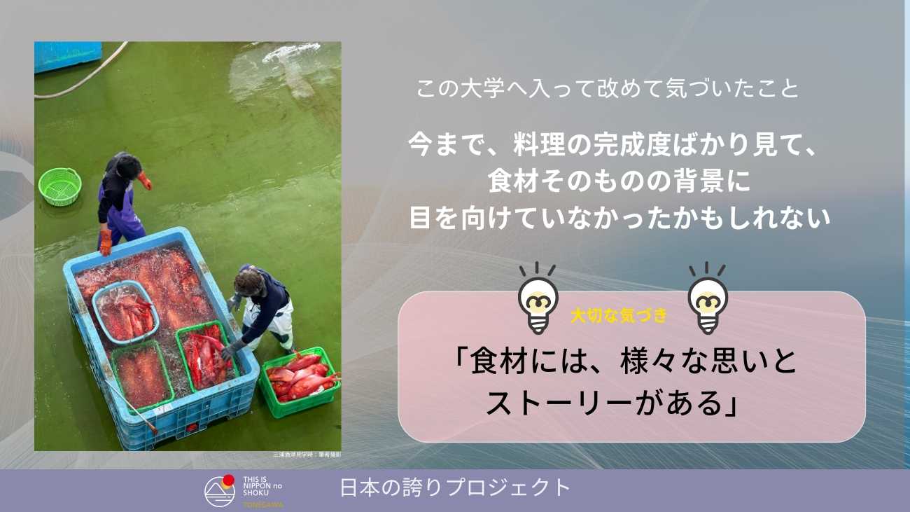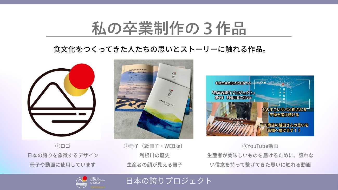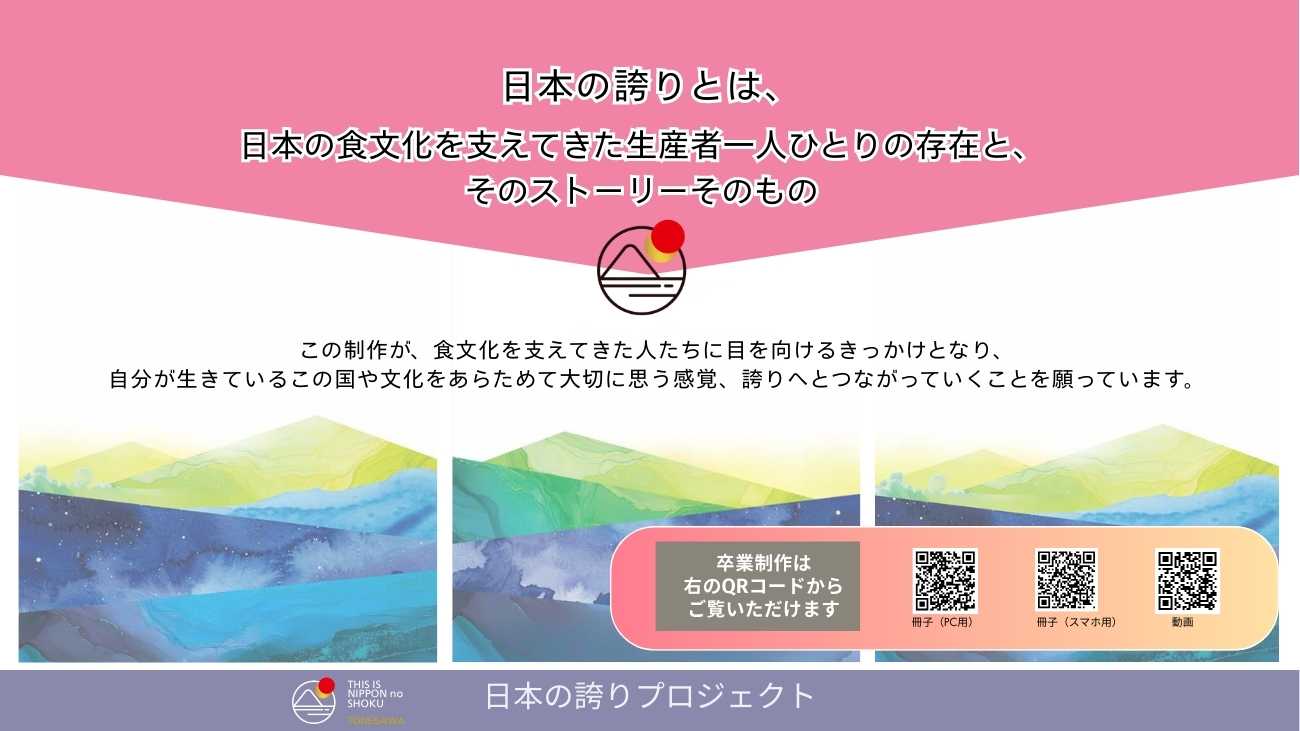 「日本の誇りとは、特別な思想や大きな言葉ではなく、日本の食文化を支えてきた人たち一人ひとりの存在と、そのストーリーなのではないか。」この卒業制作を通じて、私はこの先の学びの指標となる視点を得ました。