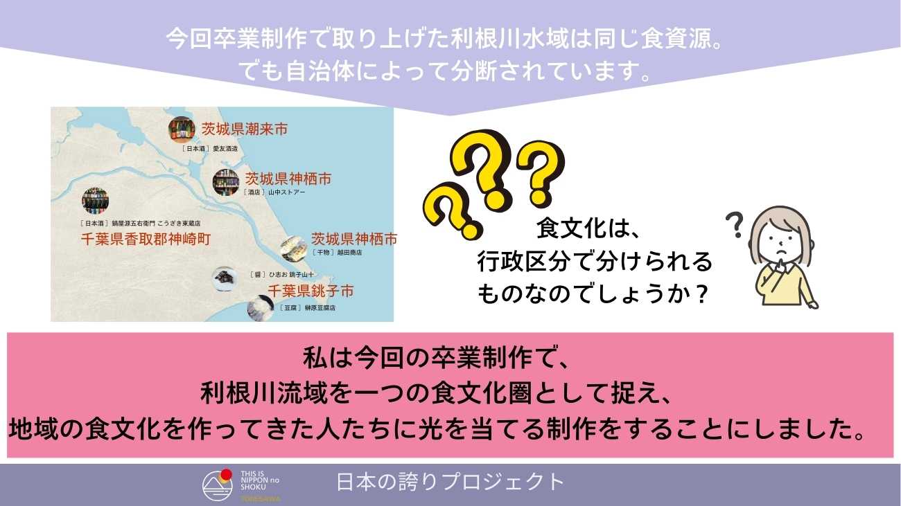 私は、利根川流域を一つの「食文化圏」と捉え、生産者の思いやストーリーを横断的につなぎ直すことを、この卒業制作で試みました。