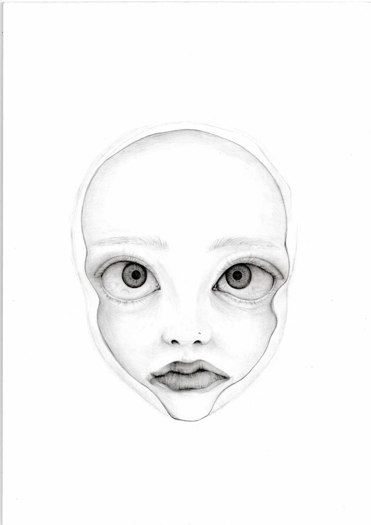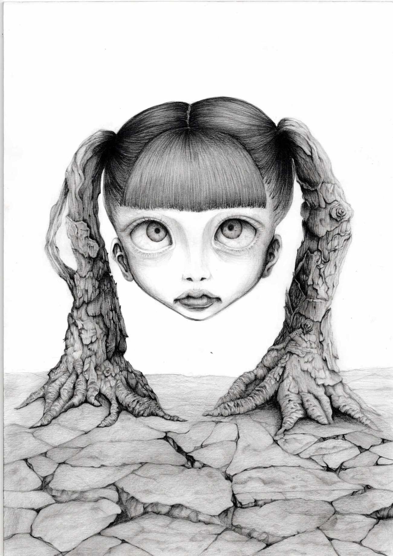 服やアクセサリー、おしゃれな髪型に頼らず、顔の造形という観点のみおいて、私なりの少女像を表現することを試みた作品である。描画では、まつげの生え際や眉毛の毛流れ、唇のしわなど、普段は注視しない顔の特徴を丁寧に描画することを意識しており、一般的にオブラートに包まれている少女の印象を露骨に可視化し、少女のアイデンティティは少女自身に帰着することを伝えたいと考えた。また、少女の造形は、自分の顔も観察しながらあえて左右非対称に描いている。この作品と対峙することで、少女のえぐみや歪さを真正面で向き合って欲しいと考えている。