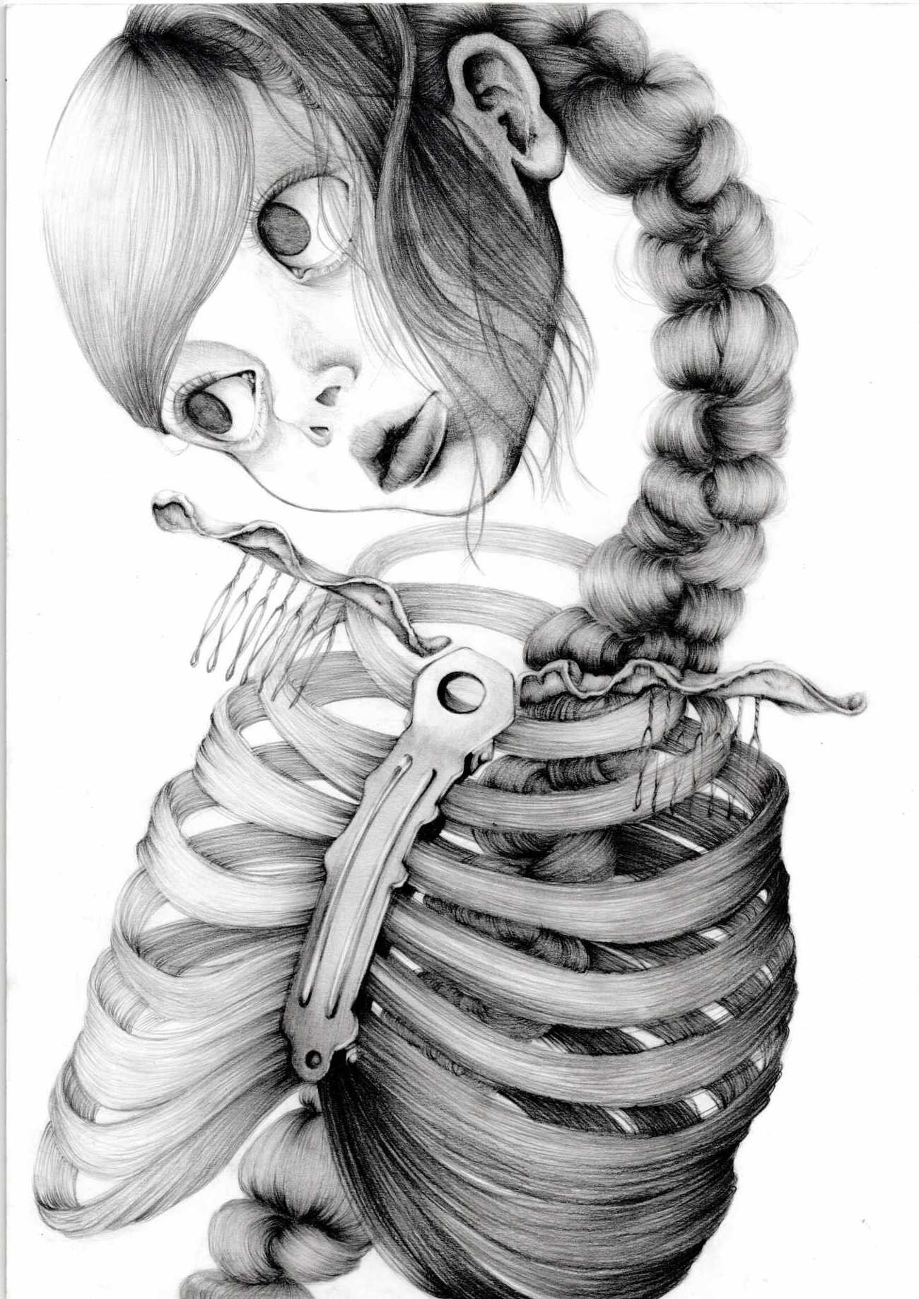 肋骨と脊髄を髪に見立て、少女が自分自身で結んだはずの髪によって苦しめられる様子を描いた作品である。髪に注目した理由は、頑固でくせの強い自分の髪に苦労した経験から、髪は自分の一部でありながらも異なる意志を持つ存在として奇妙な魅力を感じているためである。また、私にとって少女とは、自分自身との対峙によって苦悩や憎悪を抱える存在だと考えている。このことから、少女自身の髪が少女の心身を支配されている場面を表現している。