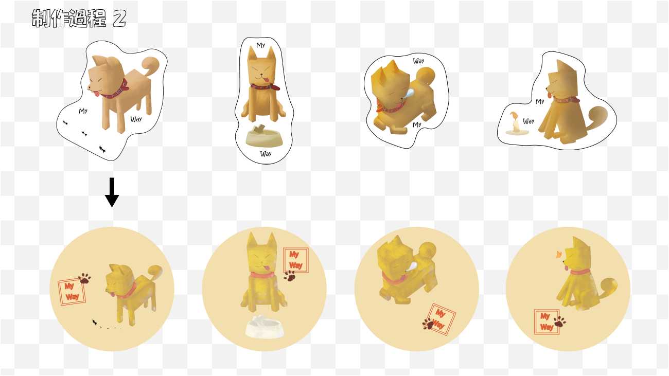 イラストは輪郭をデフォルメすることで、見る方に癒しを届けることを意識しました。キューブ状にデフォルメした犬のイラストは、マイペースに生きる自由を表現しています。