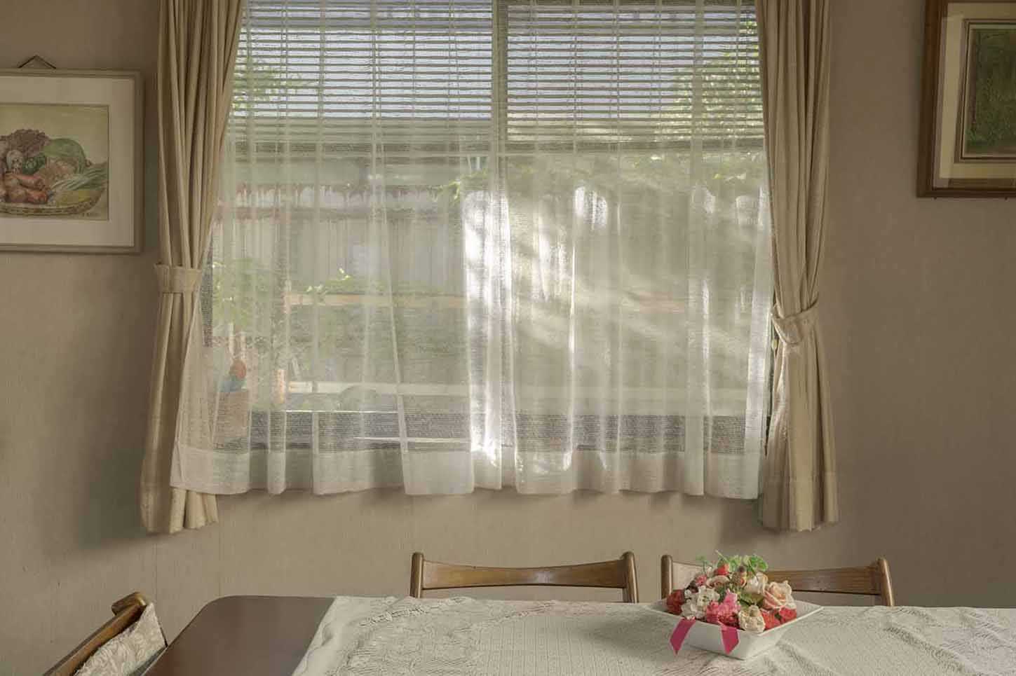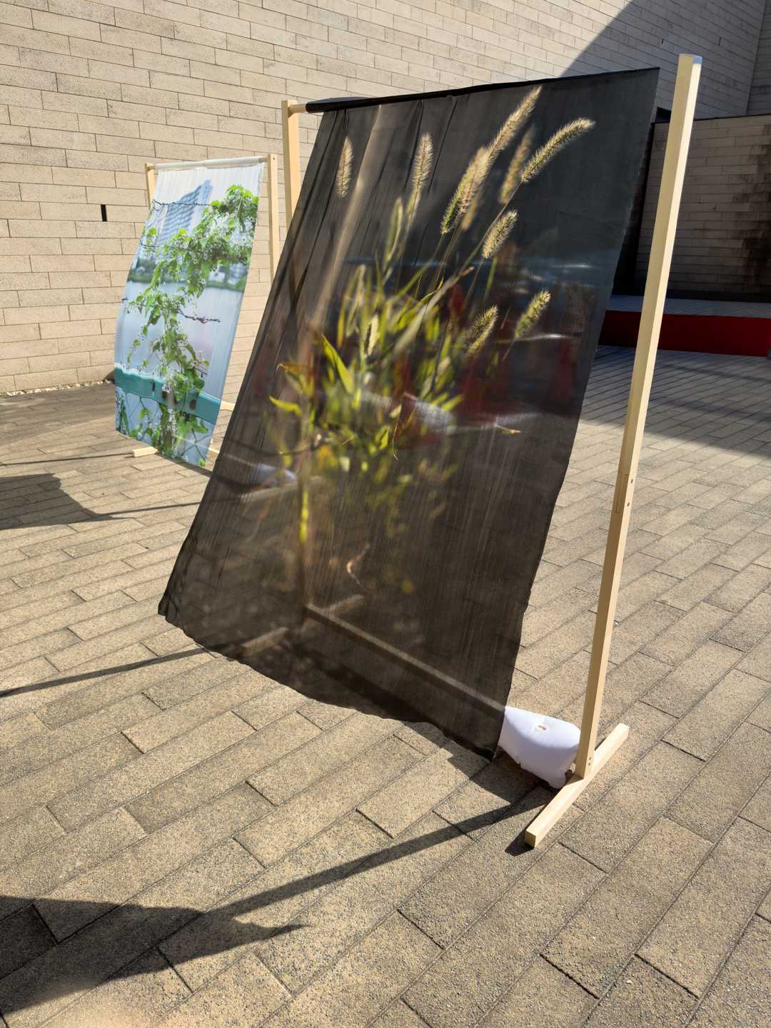 雑草の不可視化された美しさを、紙という平面から解放し、「繊維をほぐして接着する」紙ではなく、「糸として織る」布によって表現した。布は柔軟性・伸縮性を持ち、紙よりも肌に近い温度感と質感を持つため、鑑賞者の身体感覚を引き出す。糸同士を接着しない布という形態は、人間社会と一定の距離を保ちながら共生する雑草の姿を象徴している。自然環境下に置かれた作品は風・光・雨・重力といった外的条件によって形を変える。静止した写真プリントでは捉えきれない、「生きている」かのような変化を生む。