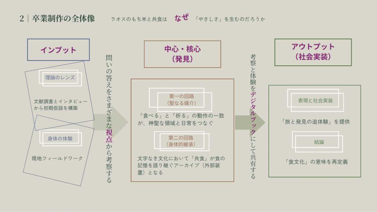 現地での様々な体験の先に「やさしさ」の正体を二つの回路として見出しました。 一つは、もち米という「聖なる媒介」です。喜捨の際の祈りの動作と、日常の食事で丸める動作。この身体的動作の一致が、聖と俗を繋ぎ、人々の精神的な安定を支える回路となっていました。