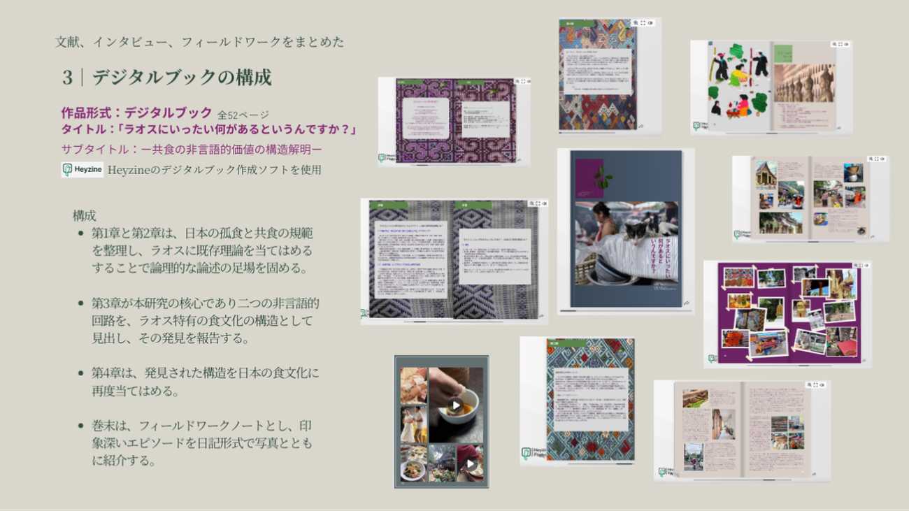 これらの発見のプロセスを自身の言葉と現地の写真や動画とともに全52ページのデジタルブックとして視覚化しました。これを卒業制作の一部である「作品」として位置付けています。