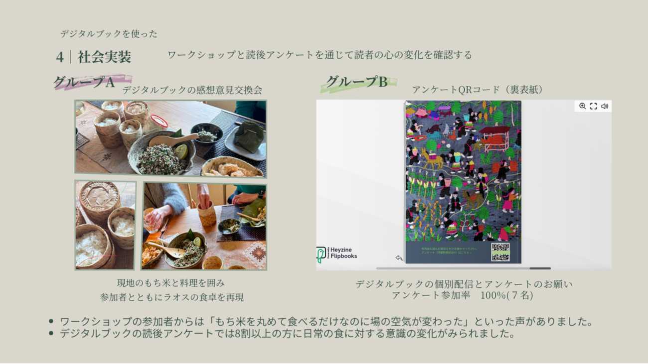 そしてこのデジタルブックを用いたワークショップや読後アンケートを実施して「社会実装」を試みました。そのフィードバックの分析からは、読者に新たな「食のレンズ」を提供できたと同時に、私自身気づかなかった視点を得ることができました。