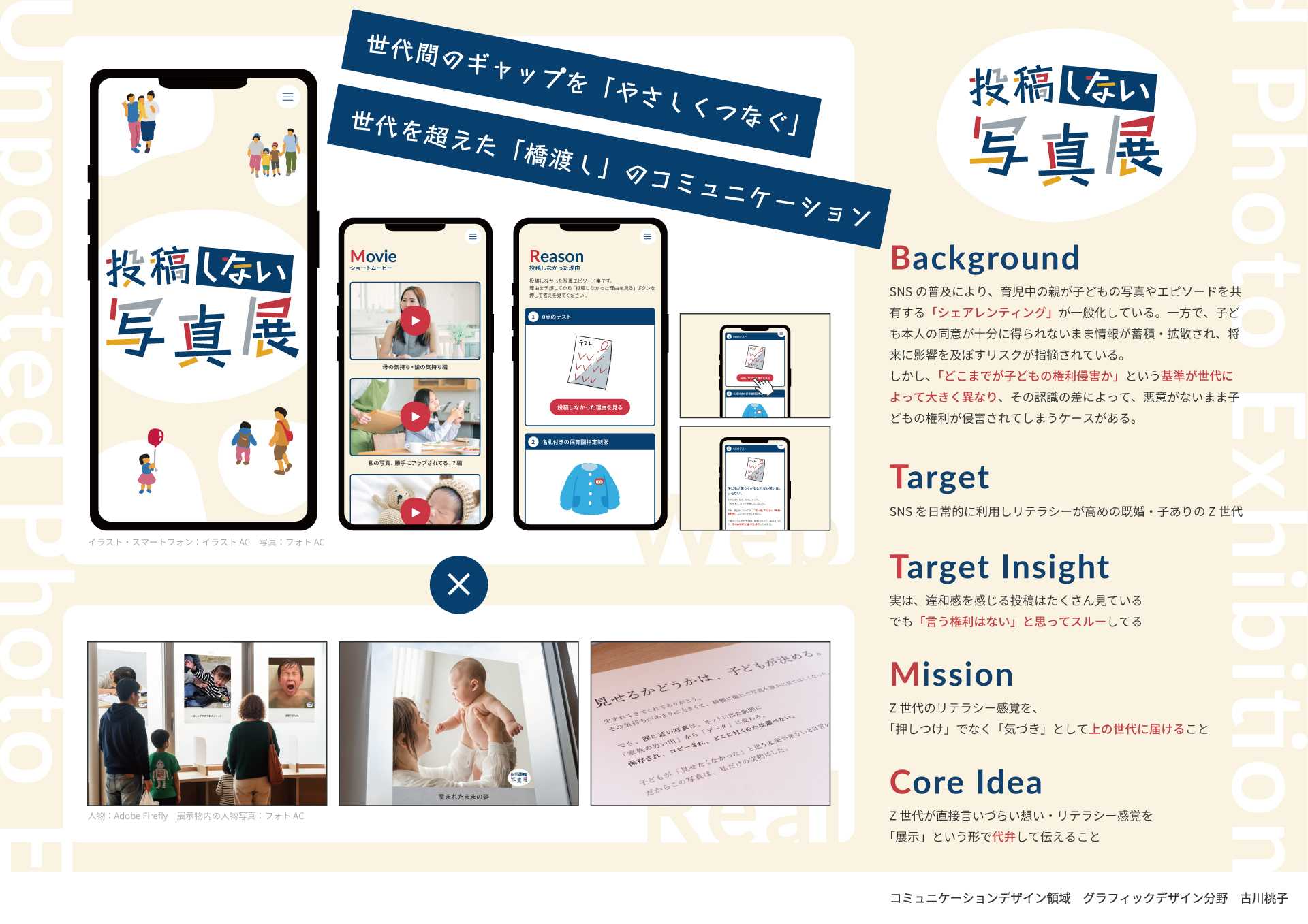 特に、インターネット上に一度公開された情報が長期に残り得る「デジタルタトゥー」のリスクに着目し、世代間のリテラシー差を超えて子どもの未来を守るためのコミュニケーションデザインについて研究した。