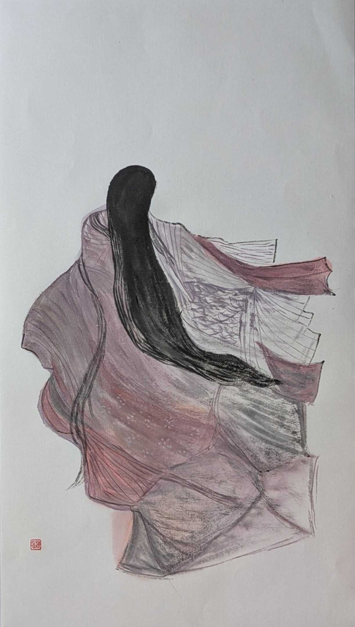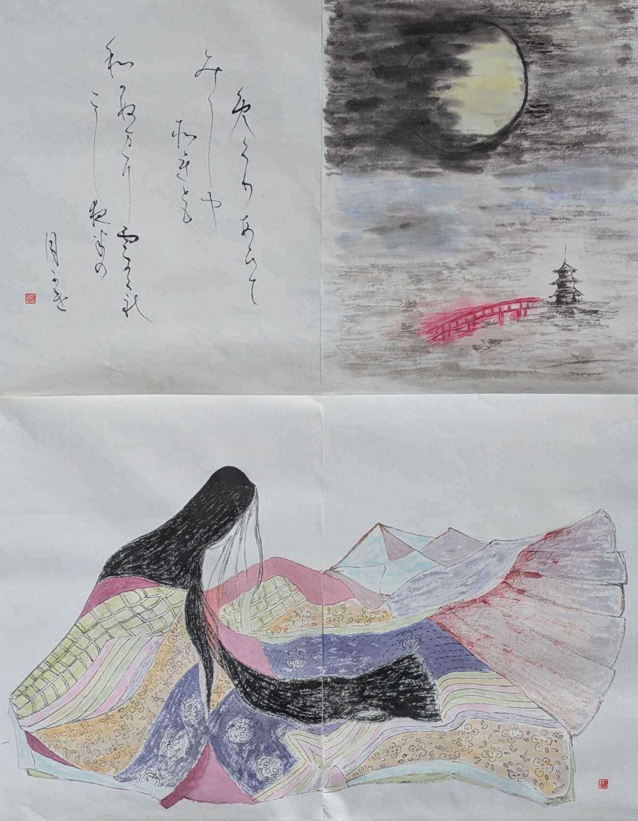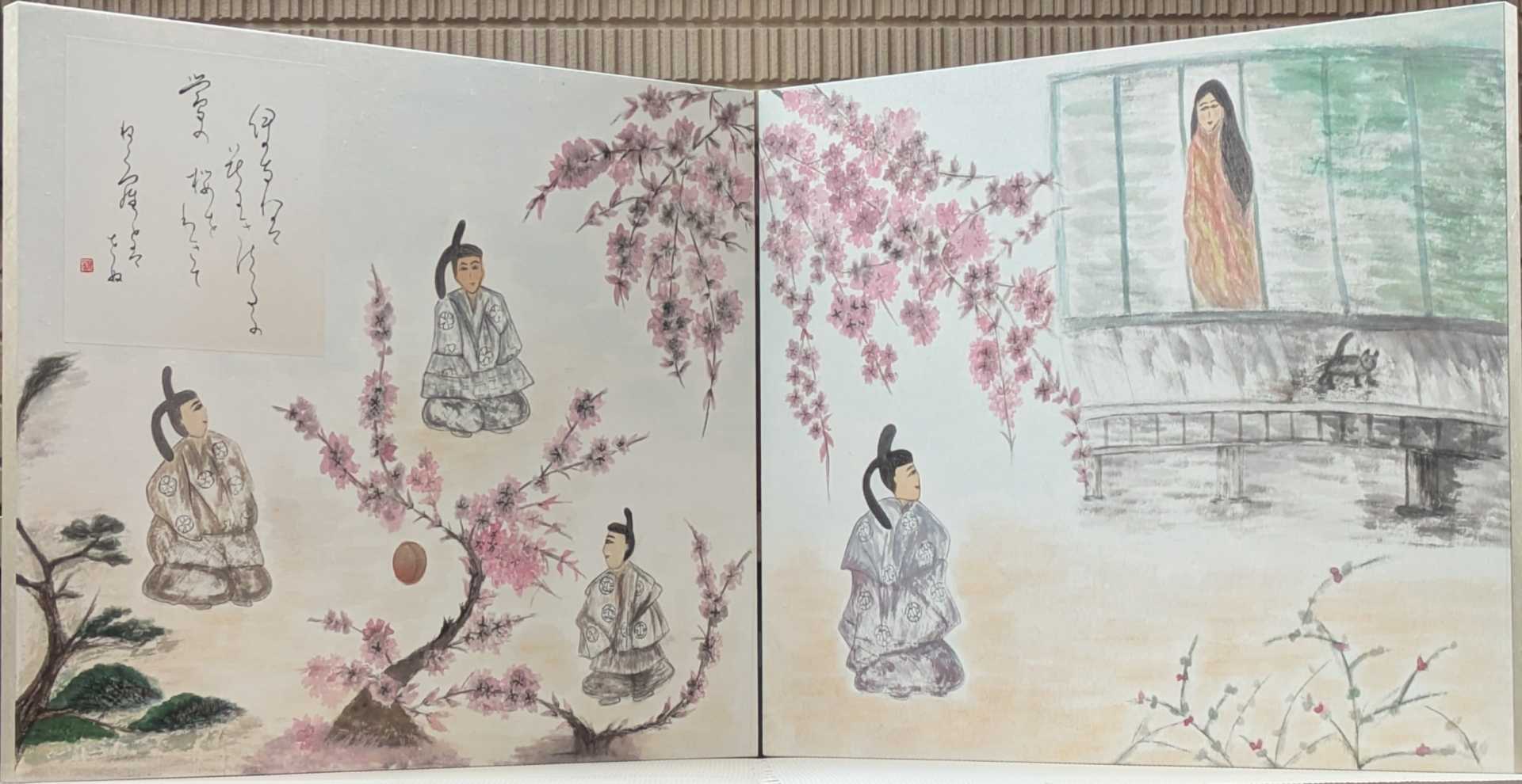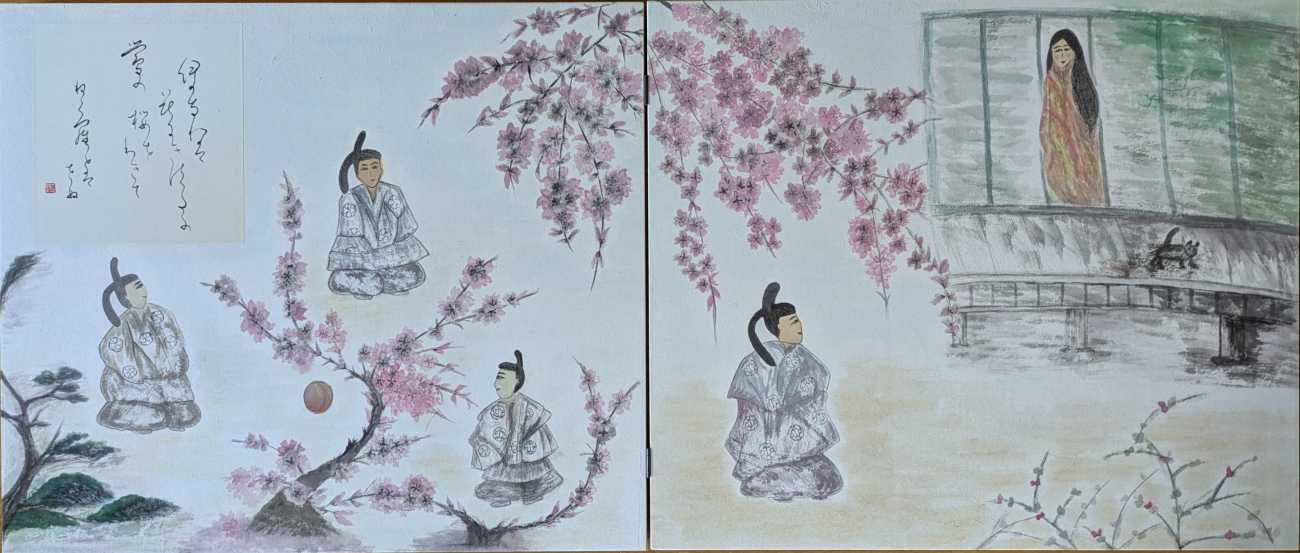画面では、殿方たちが鞠に興じる姿の中に、鞠よりも御簾へと意識を向ける柏木の不安定な視線を忍ばせ、また女三宮は猫を追うことに気を取られ、己の姿が見られていることに気づかぬ無垢さを描いた。桜の鮮やかな色彩は春の温もりと若さを象徴している。桜の華やかさと松のどっしりとした重さを対比させ、若き情念の危うさと、因果が巡り、光源氏を中心とした時代が静かに次代へ移ろう兆しを、この一場面に凝縮した。
