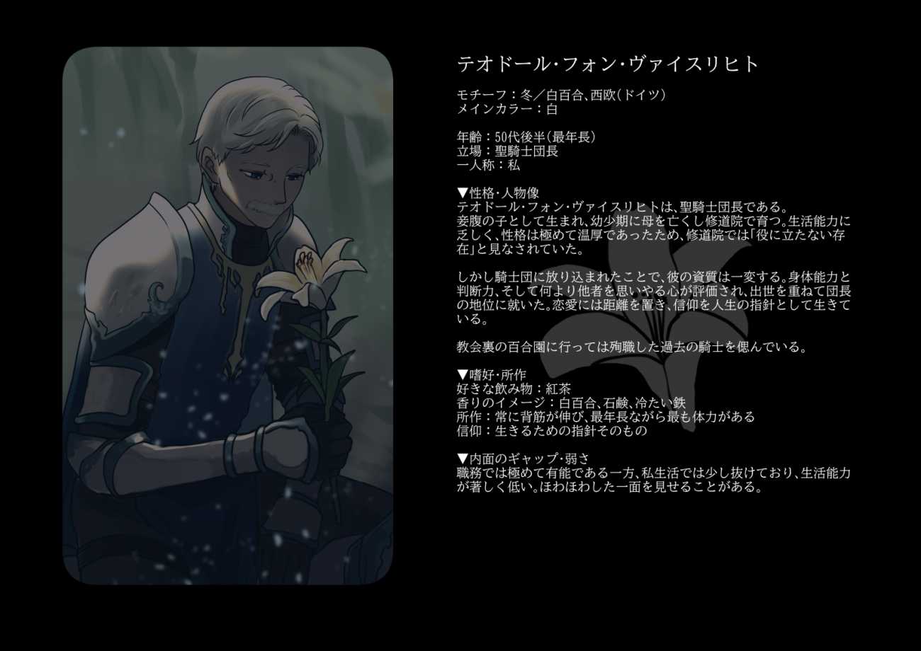 本作品は、「成熟した男性像(イケオジ)」の魅力を、四季・花・異文化美学という枠組みを通して再定義することを目的としたイラスト作品集である。