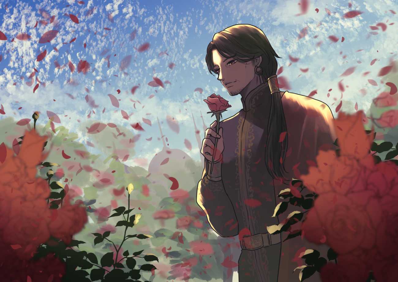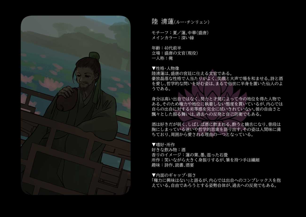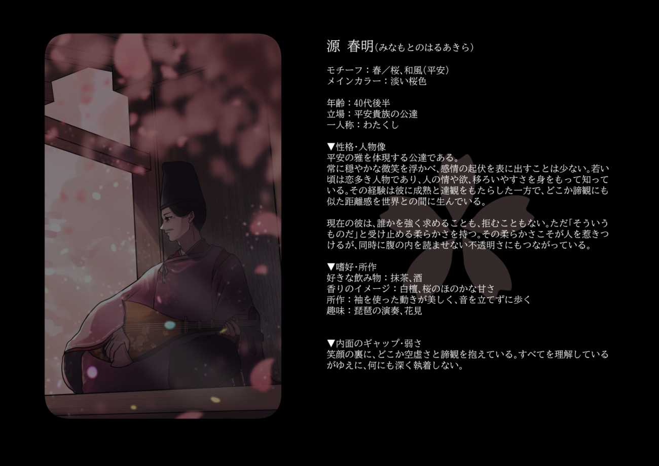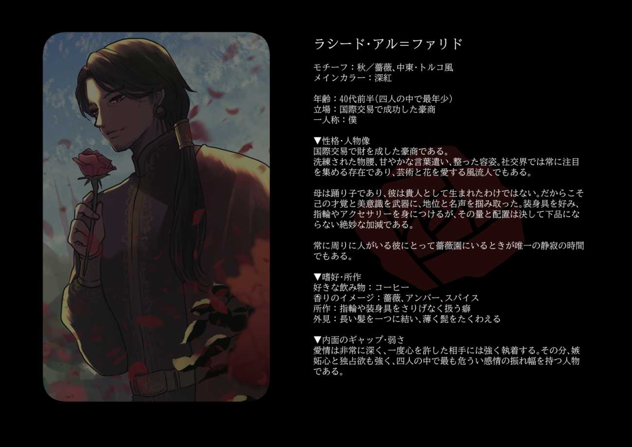 本作では、春・夏・秋・冬という四季に対応する四人の成熟した男性を描いている。それぞれに花と色彩、文化圏(和風・中華・中東・西欧)を割り当て、単なる外見的属性の違いに留まらず、その人物がどのような人生を歩んできたのかが画面から感じ取れるよう設計した。