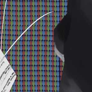 規則的な並んだRGB色の背景。RGBはテレビやスマホに用いられる光の配色であり、この3色でほぼ全ての色を再現することができる。デジタル空間における世界の成り立ちとして背景に起用した。