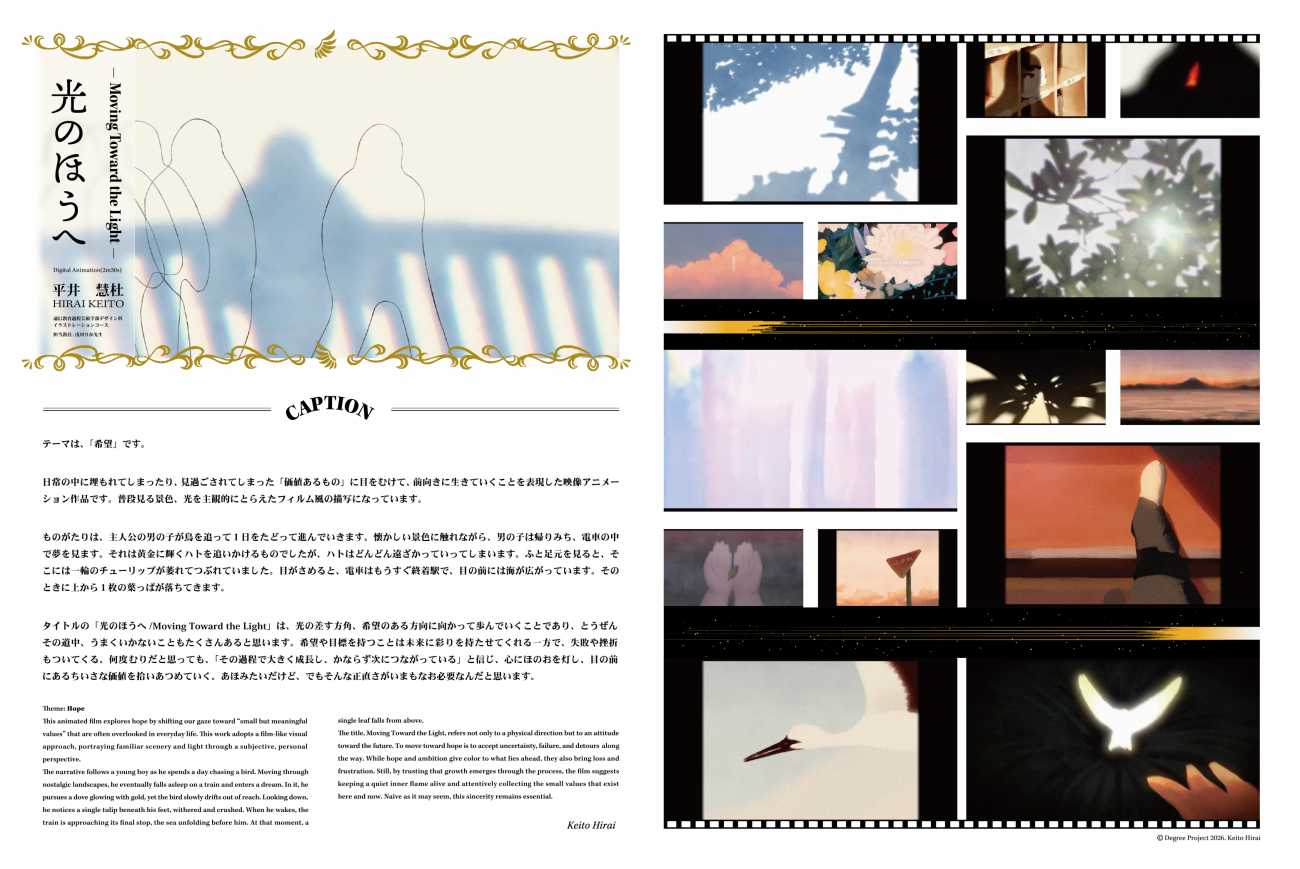 本作品において光は希望であり、かぎりなく遠く、大きな存在として位置付けられています。たとえ目指しているところに辿り着けなくても、途中でいろんなものと出会い、感じ、また多くのことを得ることができると、僕は信じています。タイトル「光のほうへ」の意味を改めて考えてみると、それは大きな目標や指標への過程であり、自分自身の軌跡とも言えます。映像の中に出てくる鳥や花もそのひとつです。