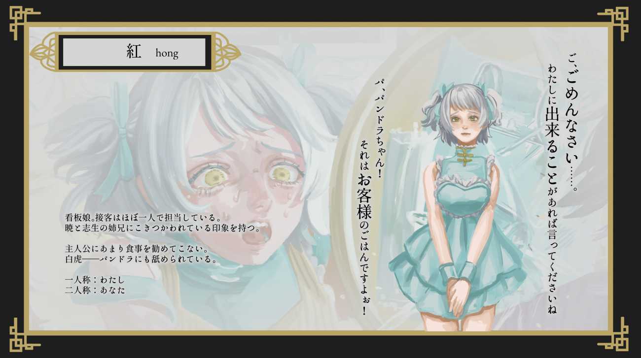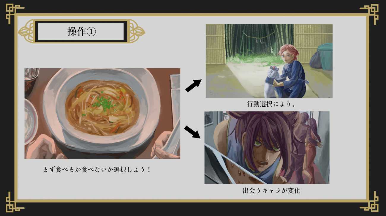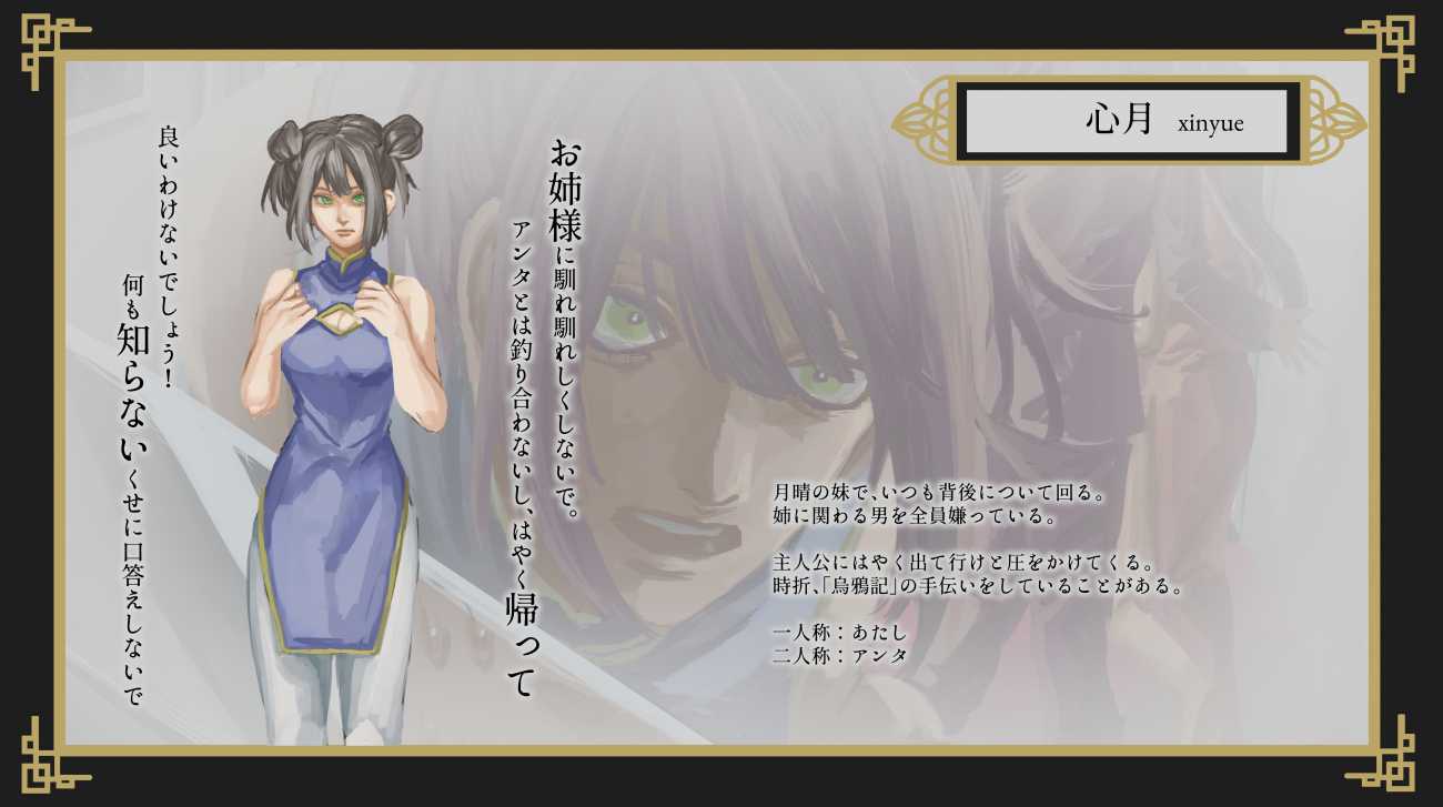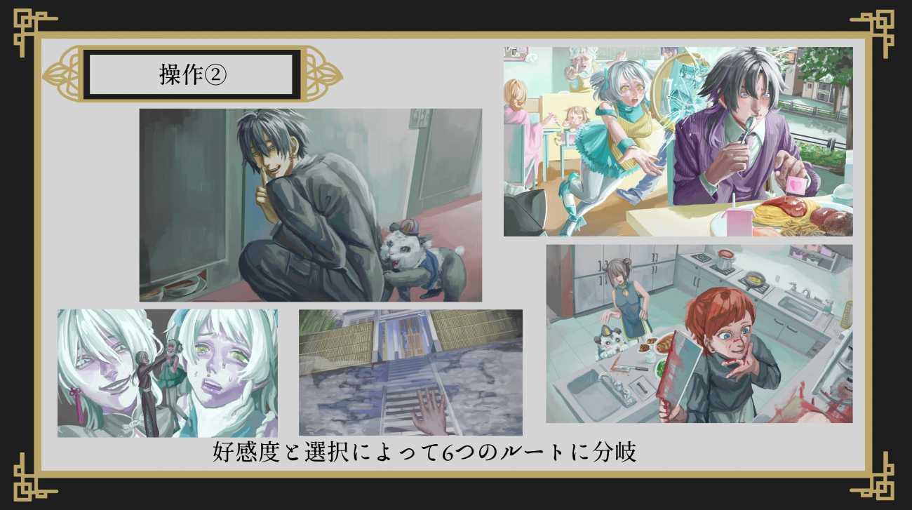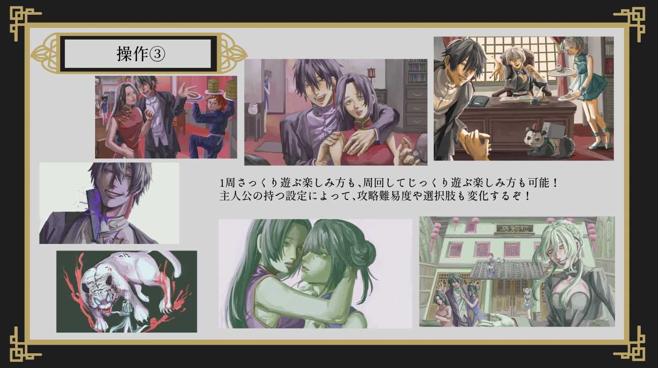 ゲームスチルの構図探求をかね、中国民俗×ホラー×恋愛をテーマにゲームデザインを行った。