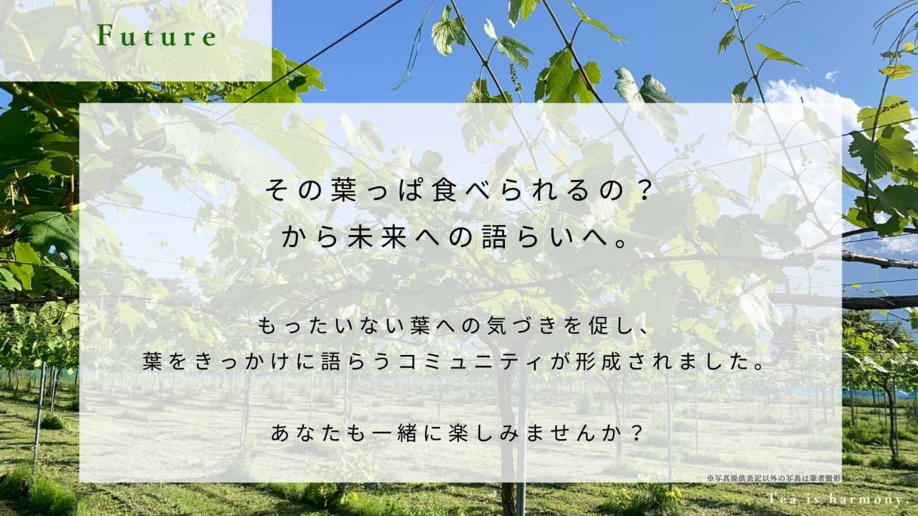 もったいない葉への気づきを促し、葉をきっかけに語らうコミュニティを形成し、人々が豊かな生活を送れるようになることを目指しました。