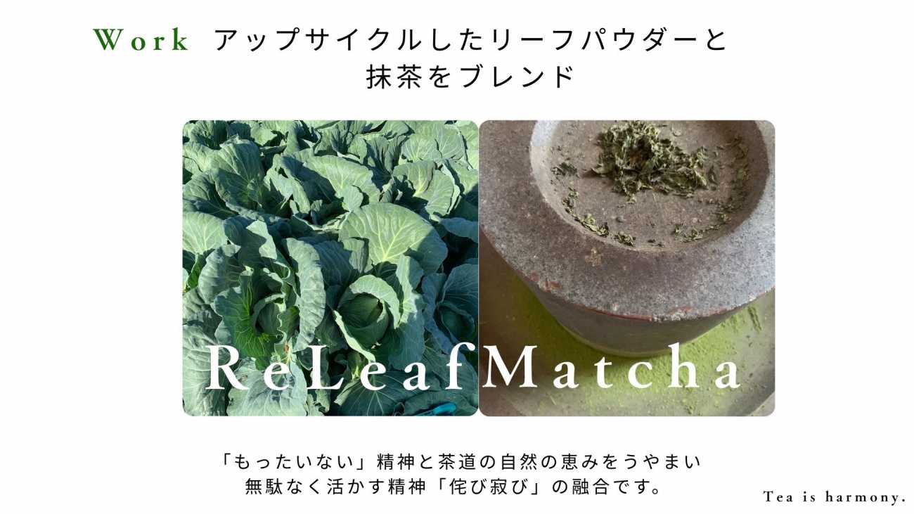 茶道には、自然の恵みを余すことなく活かし、簡素の中に豊かさを見出す「侘び寂び」の精神があります。この思想と「もったいない」精神をかけ合わせ、アップサイクルしたリーフパウダーと抹茶をブレンドした「ReLeaf Matcha」を作りました。