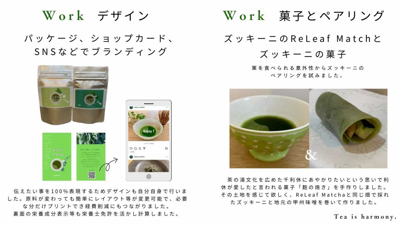 葉を食べられる意外性からズッキーニの葉のReLeaf Matchaと同じ畑で採れたズッキーニの菓子とでペアリング茶会という場を作りました。「もったいない葉」という少し身近な存在で伝統文化に気後れしてしまう人々がつながるための装置になれば良いなと思いました。