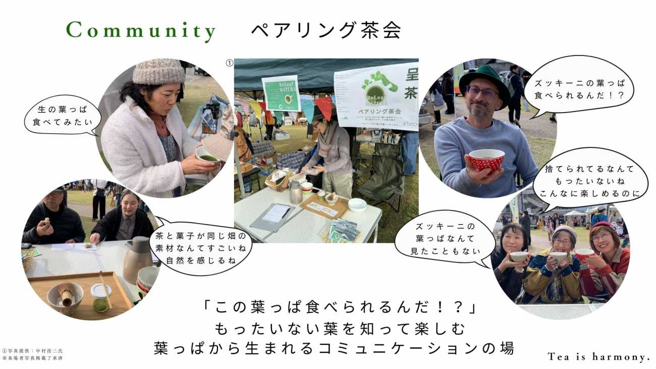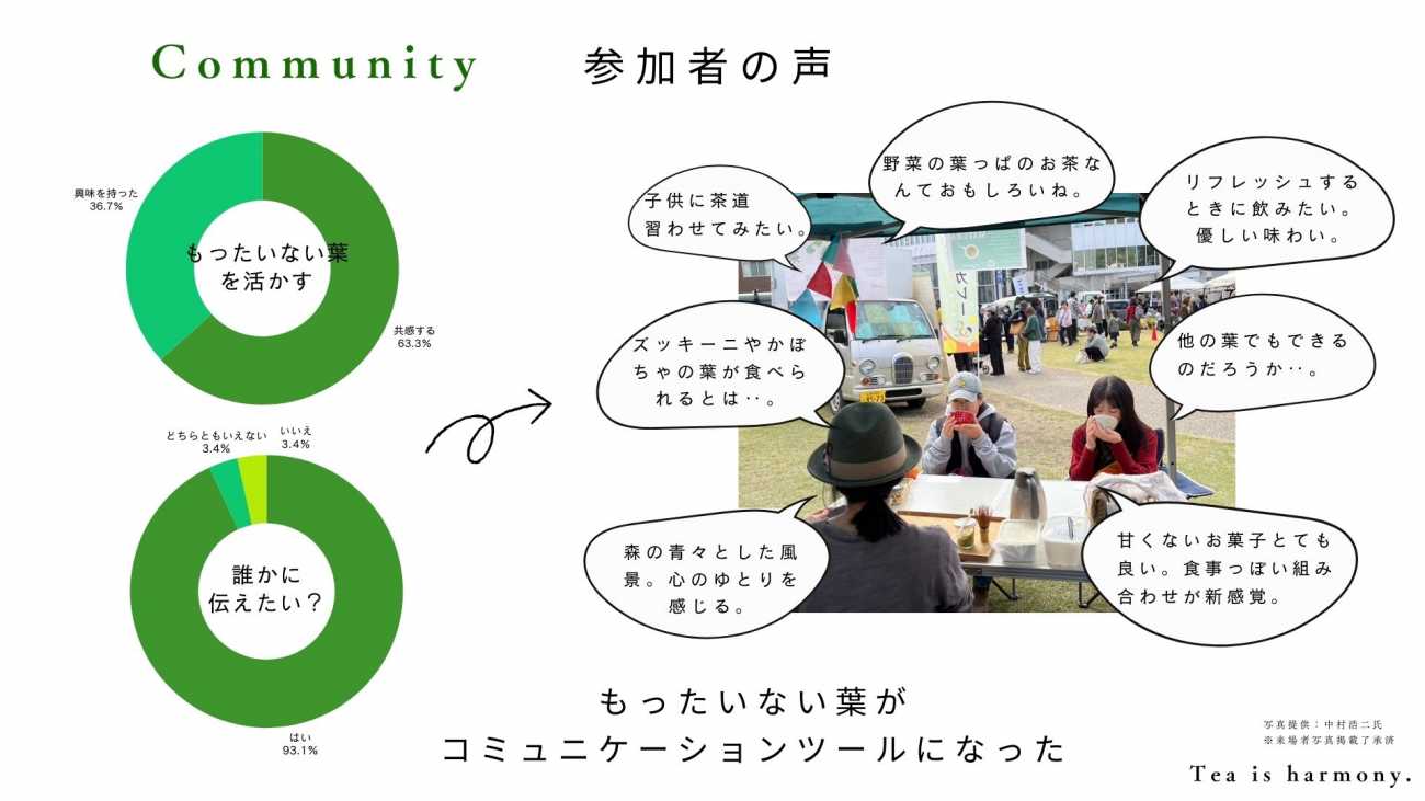 茶会では「その葉っぱ、食べられるの?」から会話が生まれ、「もったいない葉」を活かす取り組みに多くの方が共感し、「誰かに伝えたい」と感じていることが分かりました。このことから、「ReLeaf Matcha」は人と人をつなぐコミュニケーションツールとして機能したと感じています。