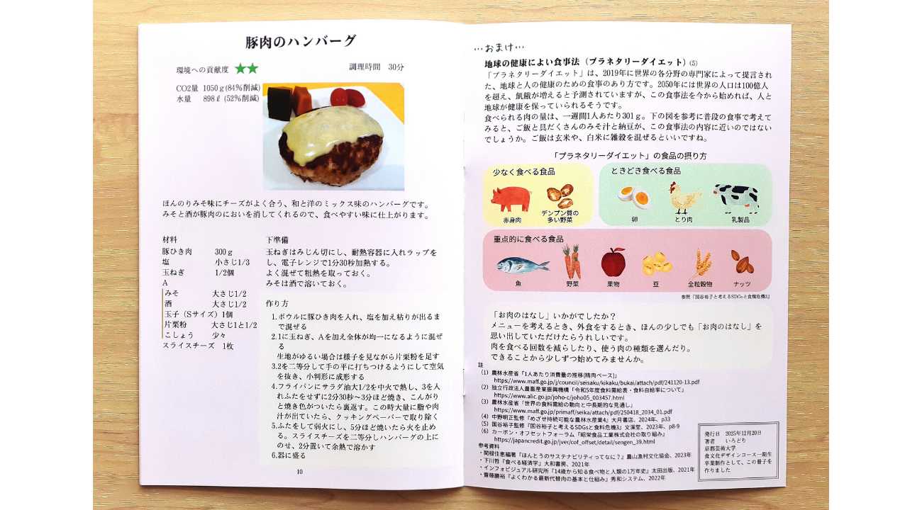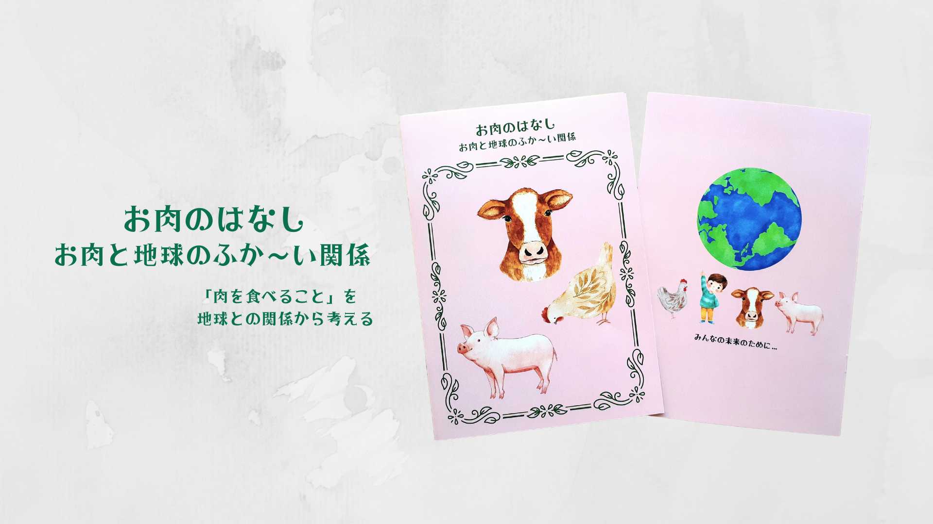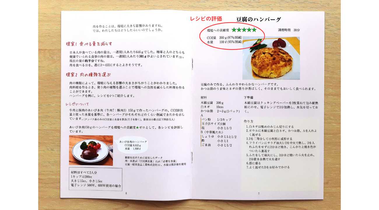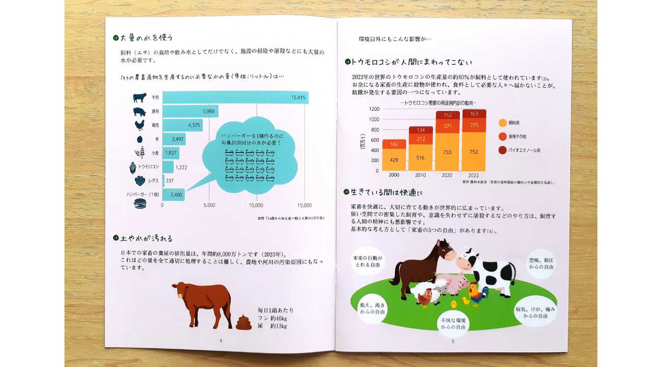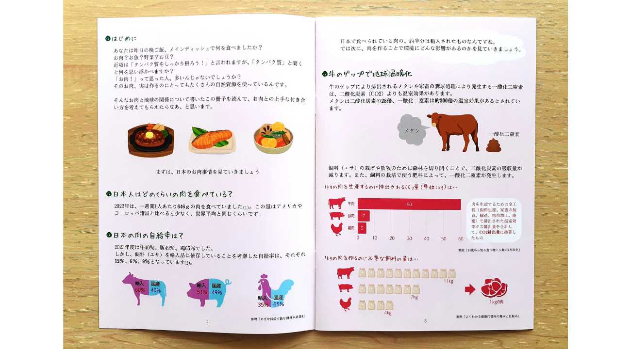 そこで、畜産は環境への負荷が大きいことを知ってもらい、「肉を食べること」について考えてもらうきっかけを作りたいと思い、冊子を作りました。