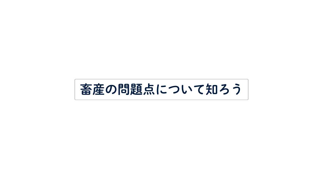大量の水が使われる(エサの栽培や飲み水など)、土や水が汚れる(適切に処理されない糞尿による農地や河川の汚染)。トウモロコシがエサとして使われ人間にまわってこない、生きている間は家畜を快適に育てよう。