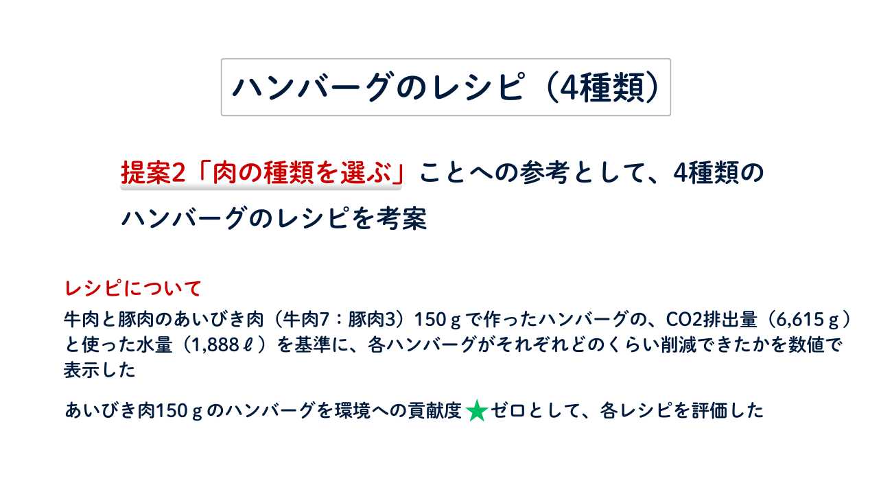 「豚肉のハンバーグ」(CO2量84%削減、水量52%削減)ほんのり味噌味にチーズがよく合う、和洋ミックス味のハンバーグ。地球と人の健康のための食事のあり方「プラネタリーダイエット」を紹介。