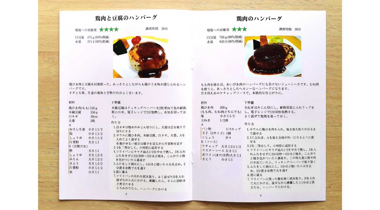 「鶏肉と豆腐のハンバーグ」(CO2量93%削減、水量80%削減)ネギ、大葉、生姜の風味豊かなハンバーグ。「鶏肉のハンバーグ」(CO2量89%削減、水量66%削減)あいびき肉にも負けないジューシーさ。