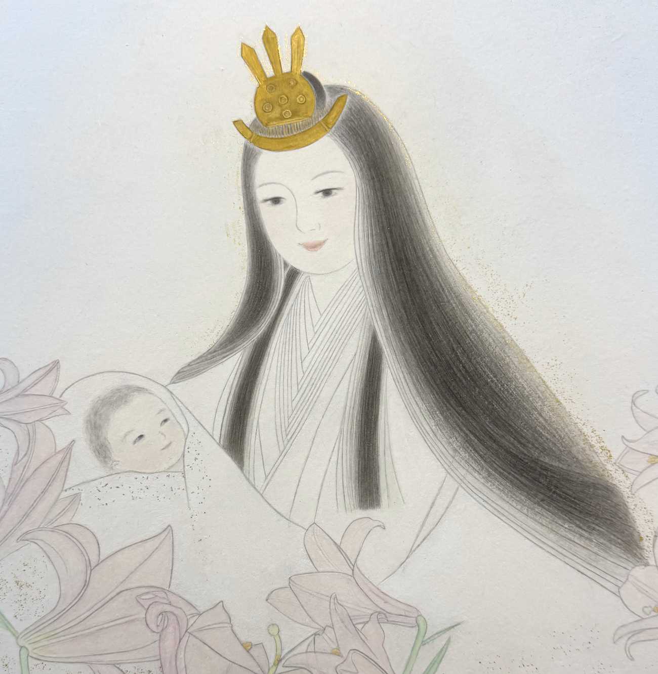 自身の名から日本固有種のささゆりに魅了され、咲き誇る夏に息子を授かりました。自然のいとなみの中で命がはじまり継承される神聖さを、お母さんが日本の伝統文化の白の十二単装束を装い、ささゆりに祝福されている赤ちゃんを抱っこしている姿で表現しています。