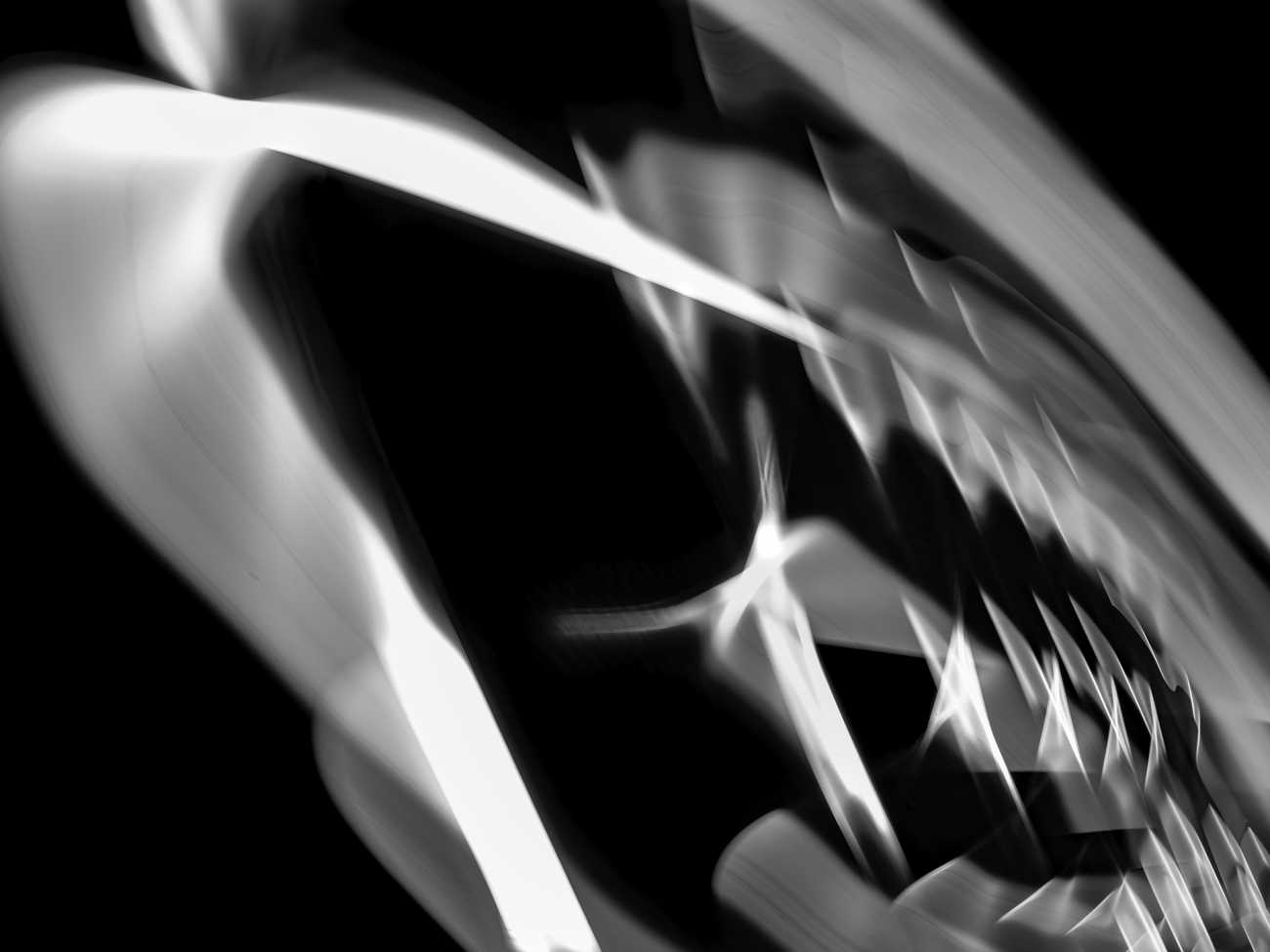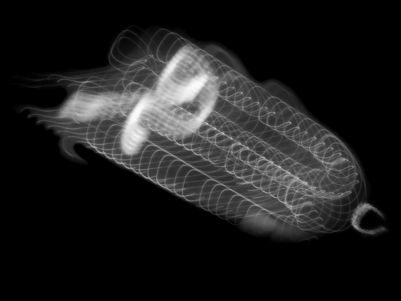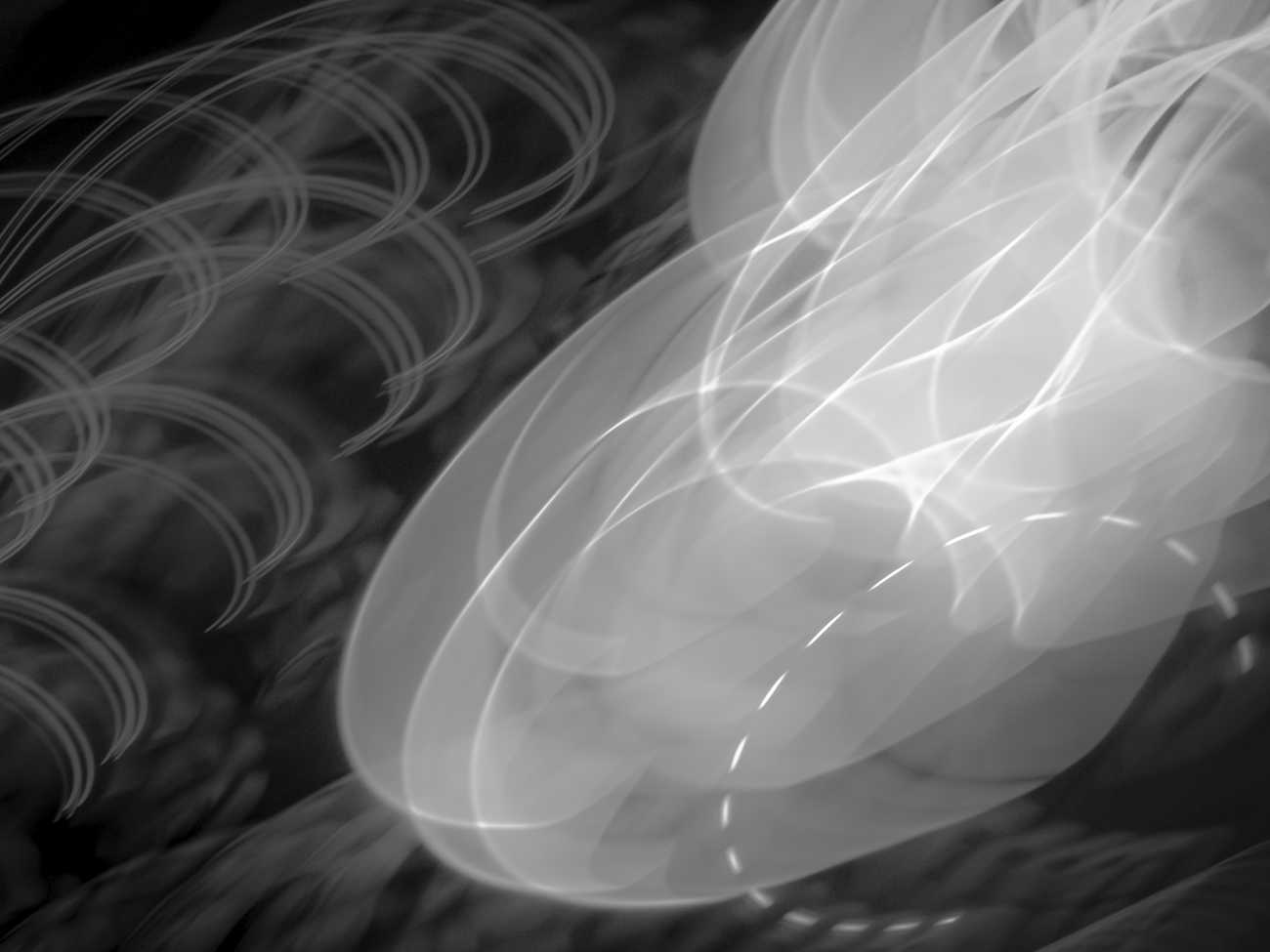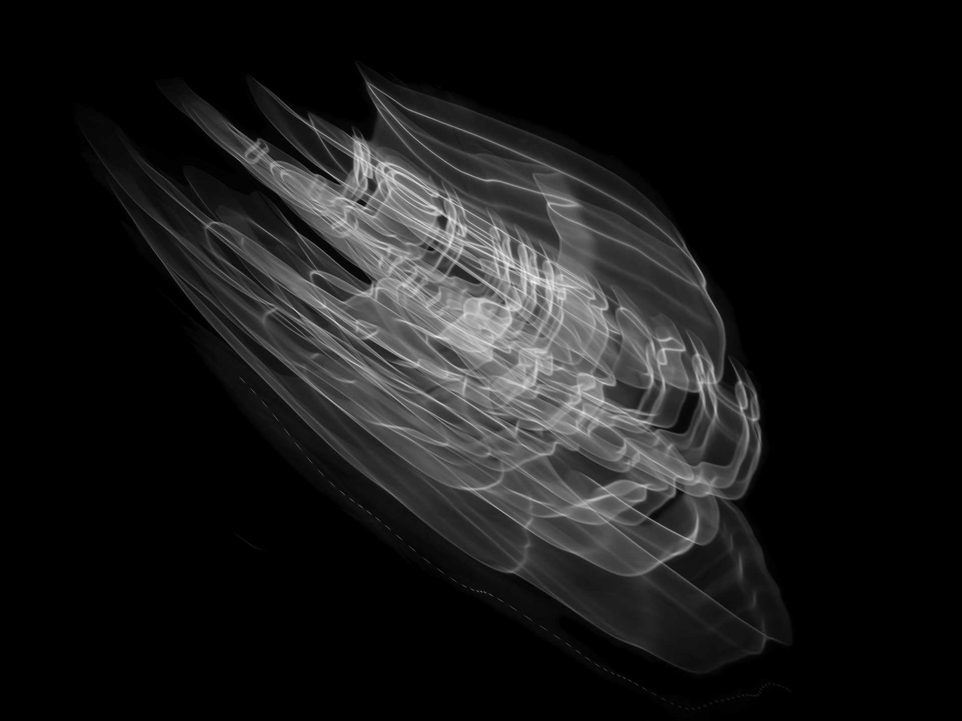 ここに現れる光は、二つの側面を持つ。一つは、デジタル上で再構成され、漆黒を浮遊する有機的な「発光体」としての姿。もう一つは、具体的な情報が削ぎ落とされ、溶け出した「エネルギーの軌跡」として立ち現れる抽象的な姿である。
