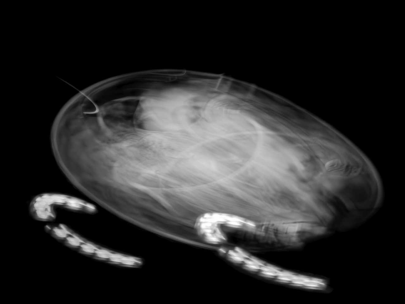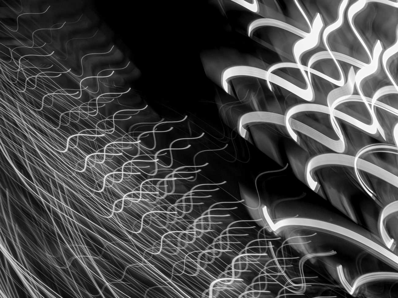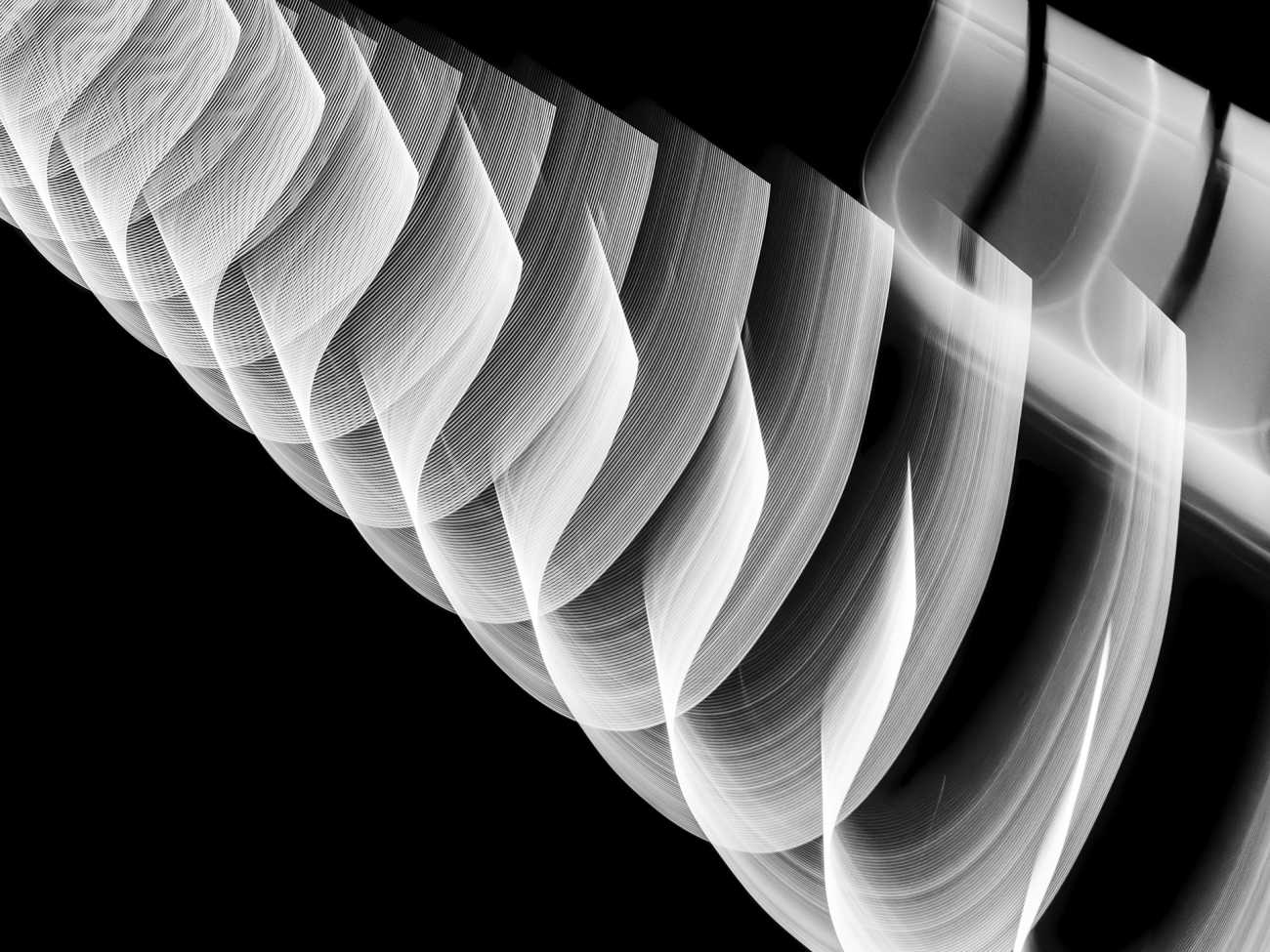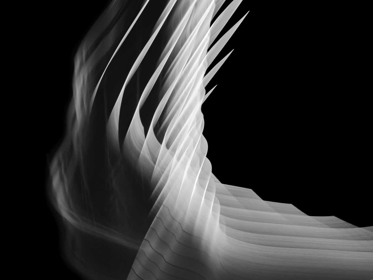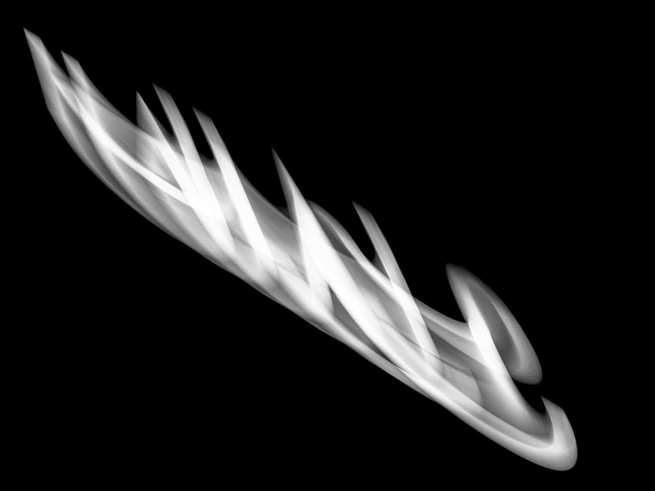 ここに現れる光は、二つの側面を持つ。一つは、デジタル上で再構成され、漆黒を浮遊する有機的な「発光体」としての姿。もう一つは、具体的な情報が削ぎ落とされ、溶け出した「エネルギーの軌跡」として立ち現れる抽象的な姿である。
