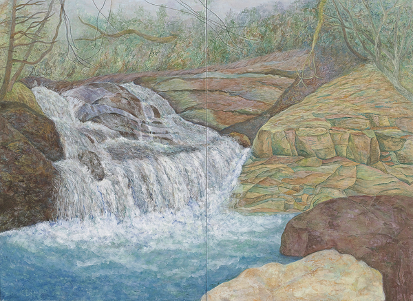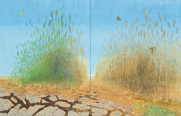 厳しい自然に耐える力を蓄えている植物たちの力強さとたくましさ、黙して私達に感動を届けてくれる存在を表現したかった。冬の厳しさを残しつつ、それでも時々ふと春の気配を感じる、そんな春が待ち遠しい春寒の季節にいち早く春を届けてくれる木蓮の白。早朝の透明な空気の中で大地の恵みを満喫している木蓮の姿を描いた。