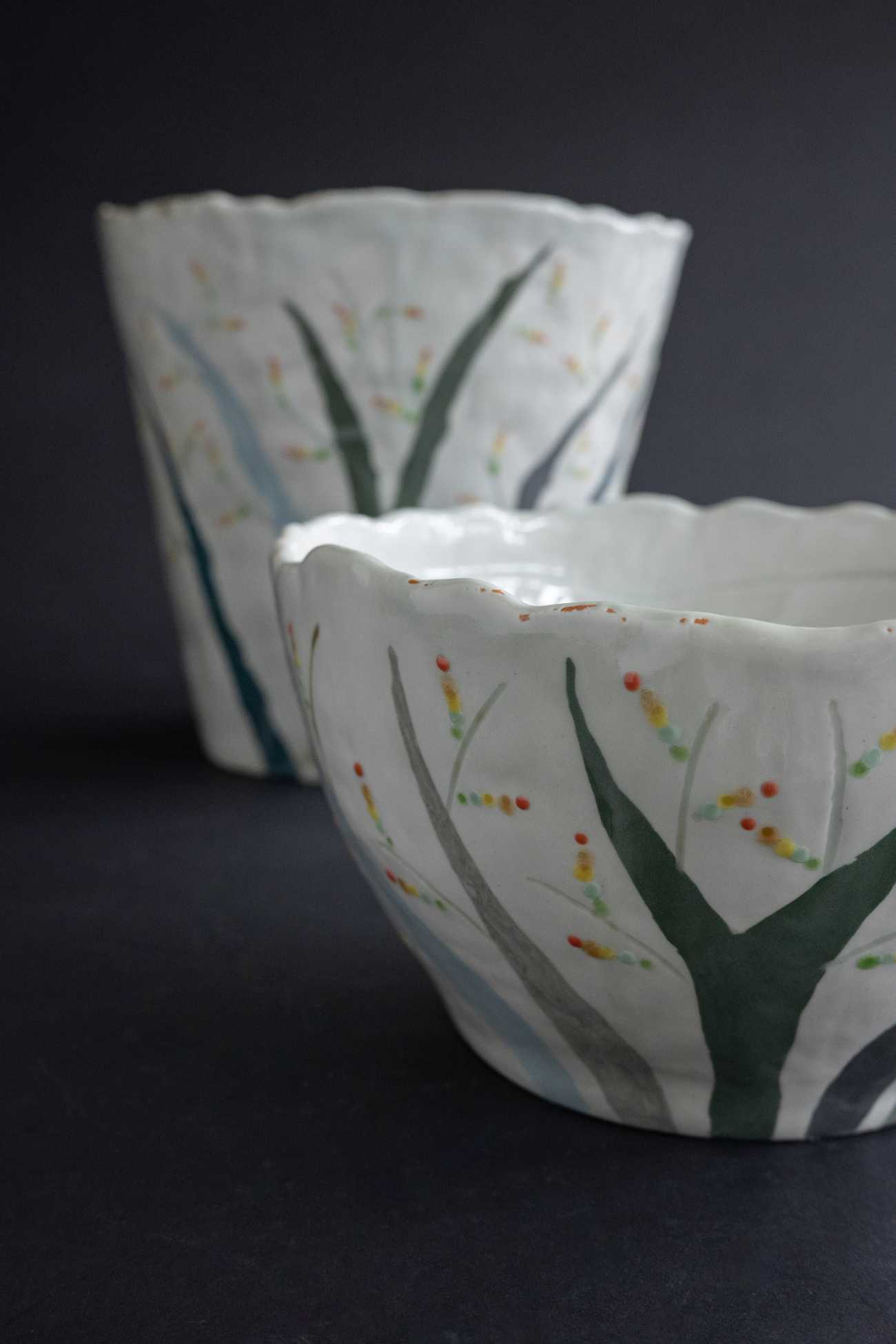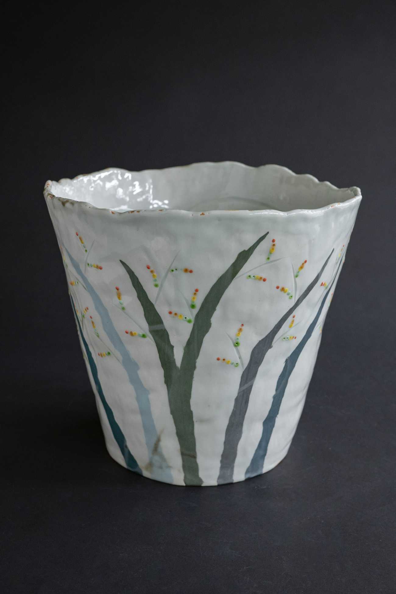 半磁土、色粘土/土灰釉/還元焼成/手びねり、象嵌、上絵