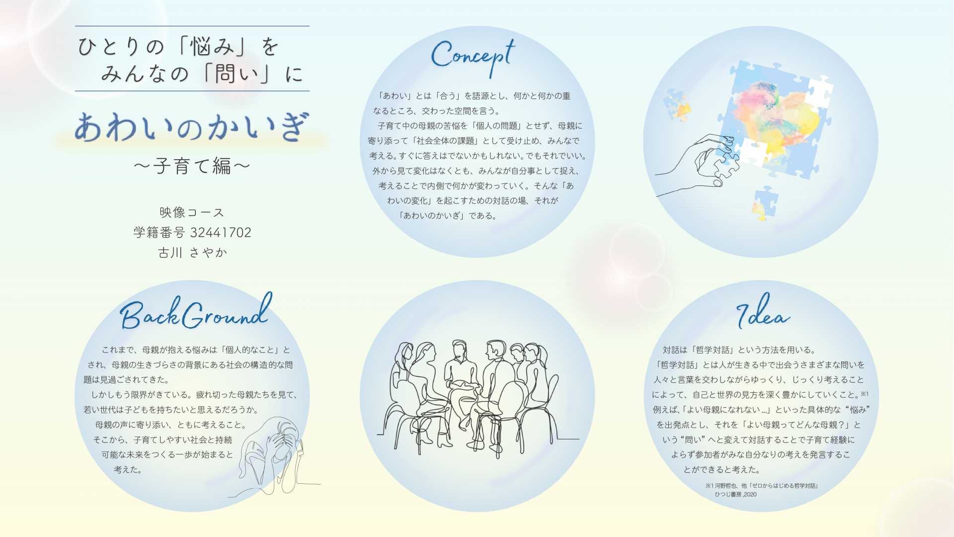 「哲学対話」とは「問い」について他者と一緒に考えて、対話することをいう。例えば、「よい母親になれない」という悩みを「よい母親とは?」という問いに置き換えて対話することで、子育て経験の有無に関わらず、誰もが自分事として考えられる。そしてこの「自分事化」と他者との「対話」によって得られた気付きが母親の声に気付く一歩になるのではと考えた。