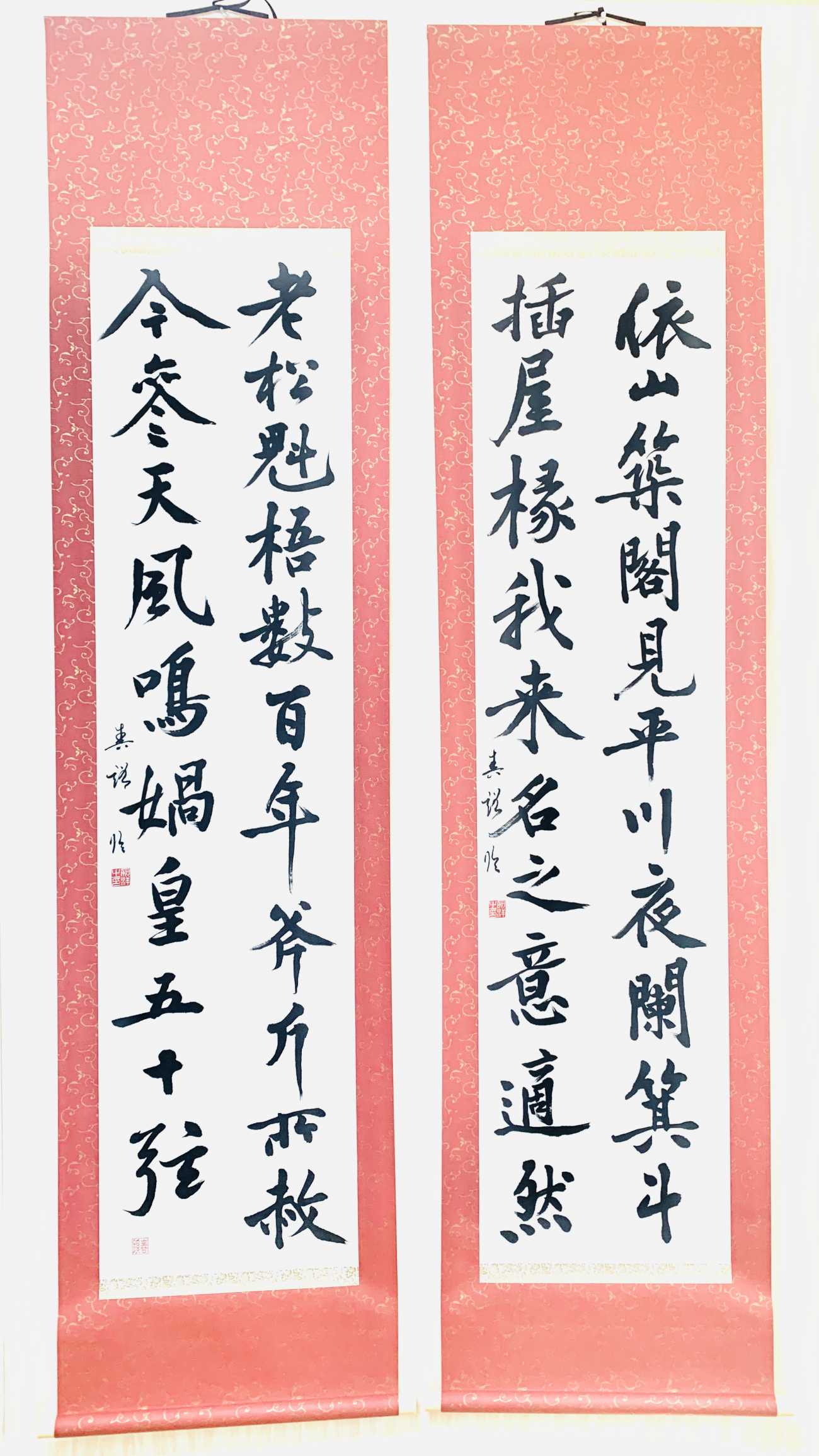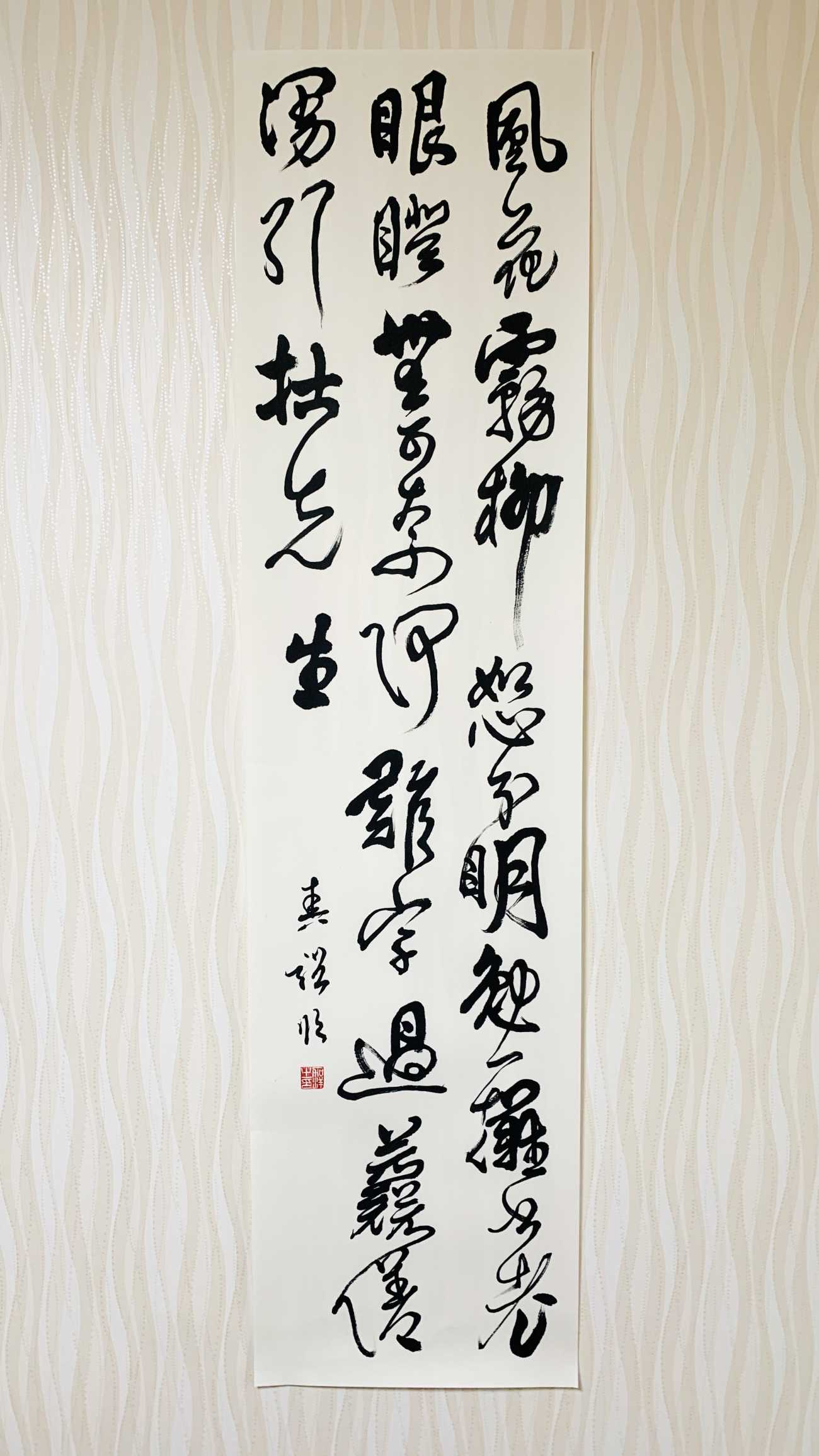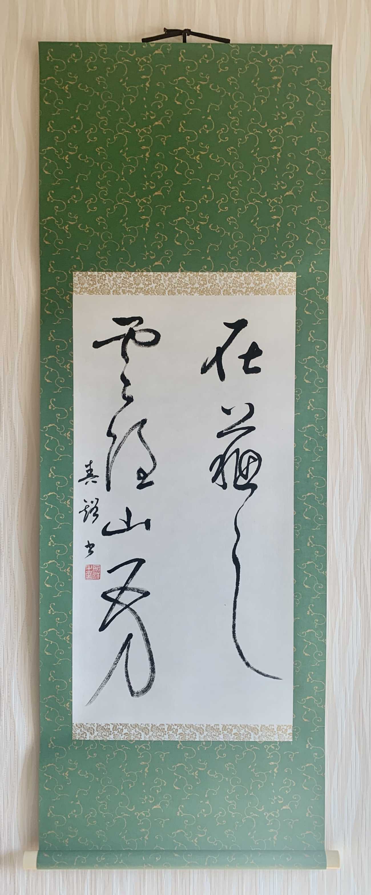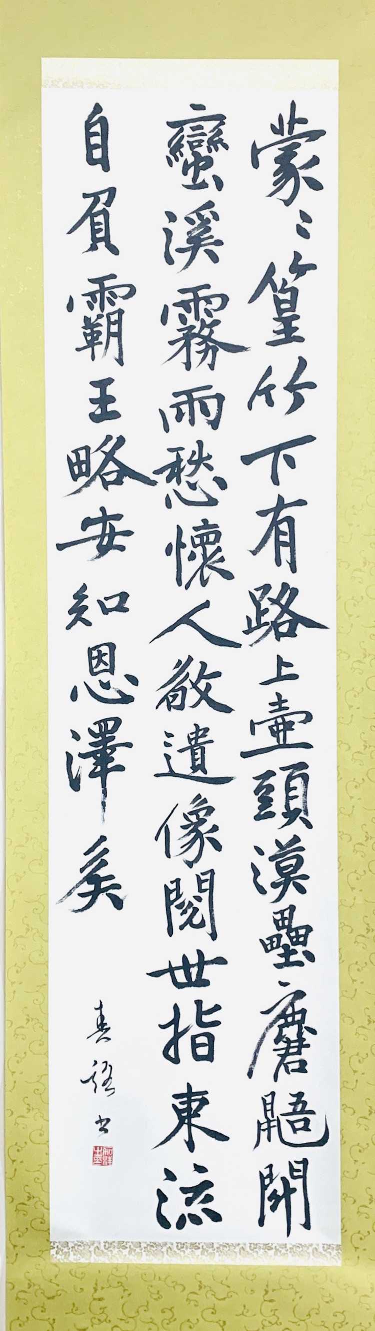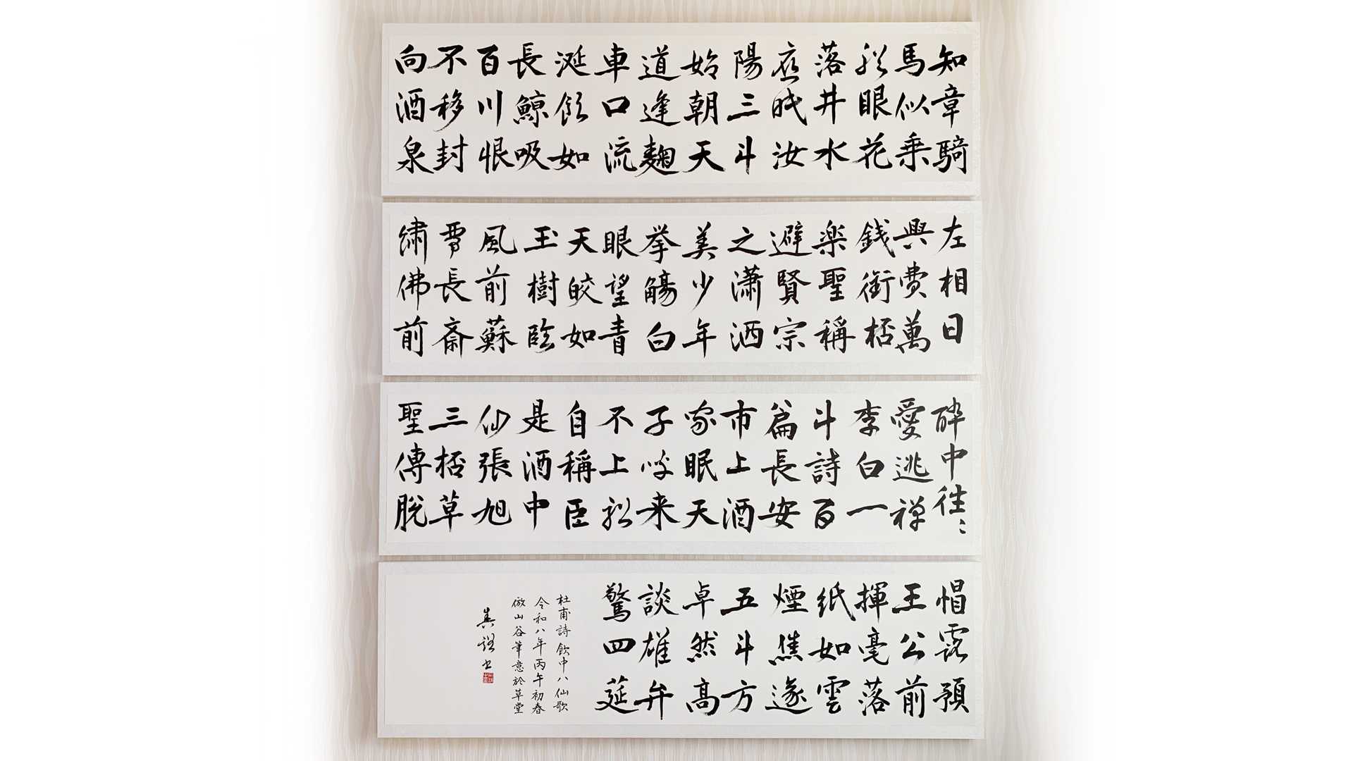 取り憑かれたように一貫して黄庭堅を追求してきた。古典の基礎となる王羲之、顔真卿、褚遂良なども良いが「松風閣詩巻」「伏波神祠詩巻」などを臨書し黄庭堅の作法を練習してきた。黄庭堅の理解と他作品への応用として創作作品「飲中八仙歌」を題材とし黄庭堅の書法に留意しながら書き進めていった。創作性、表現性そして自らの黄庭堅に対する尊敬と憧れの意をもって個性を出すことを試みた。禅に傾倒していく黄庭堅の清貧さを表現するために白色のモダンでシンプルな縁で表具し黒と白の対比を明らかにした。敢えて行書にし、黄庭堅らしい多折法の揺らぎや、はらい、はねなど表現した。面白い詩の中に硬い真面目な印象の黄庭堅の書を垣間見ることができればと考えた。理屈や意識でなく自分の感性に訴えかける魅力が私を突き動かした作品である。