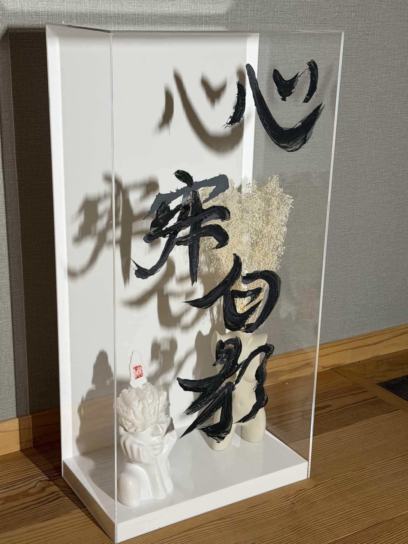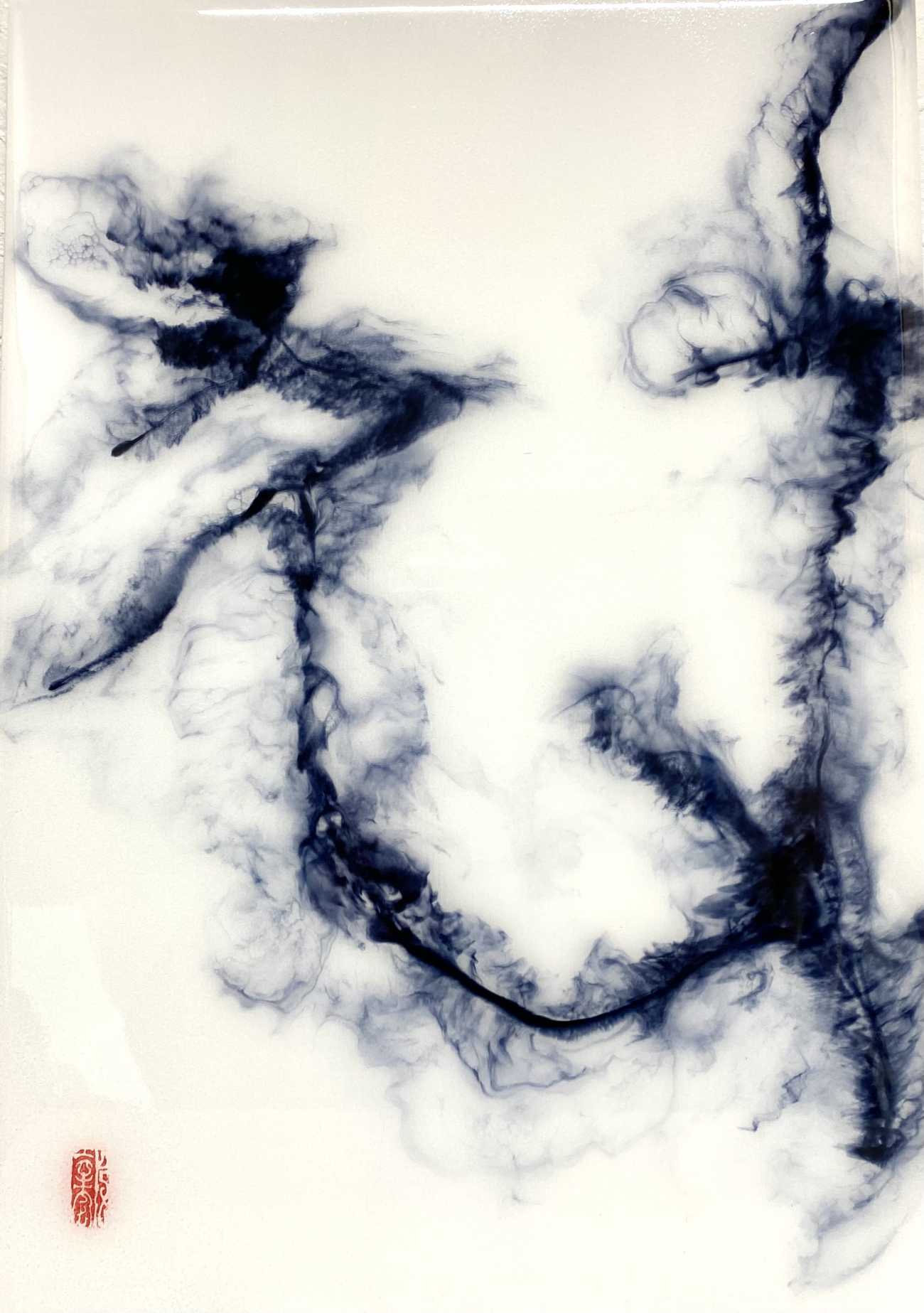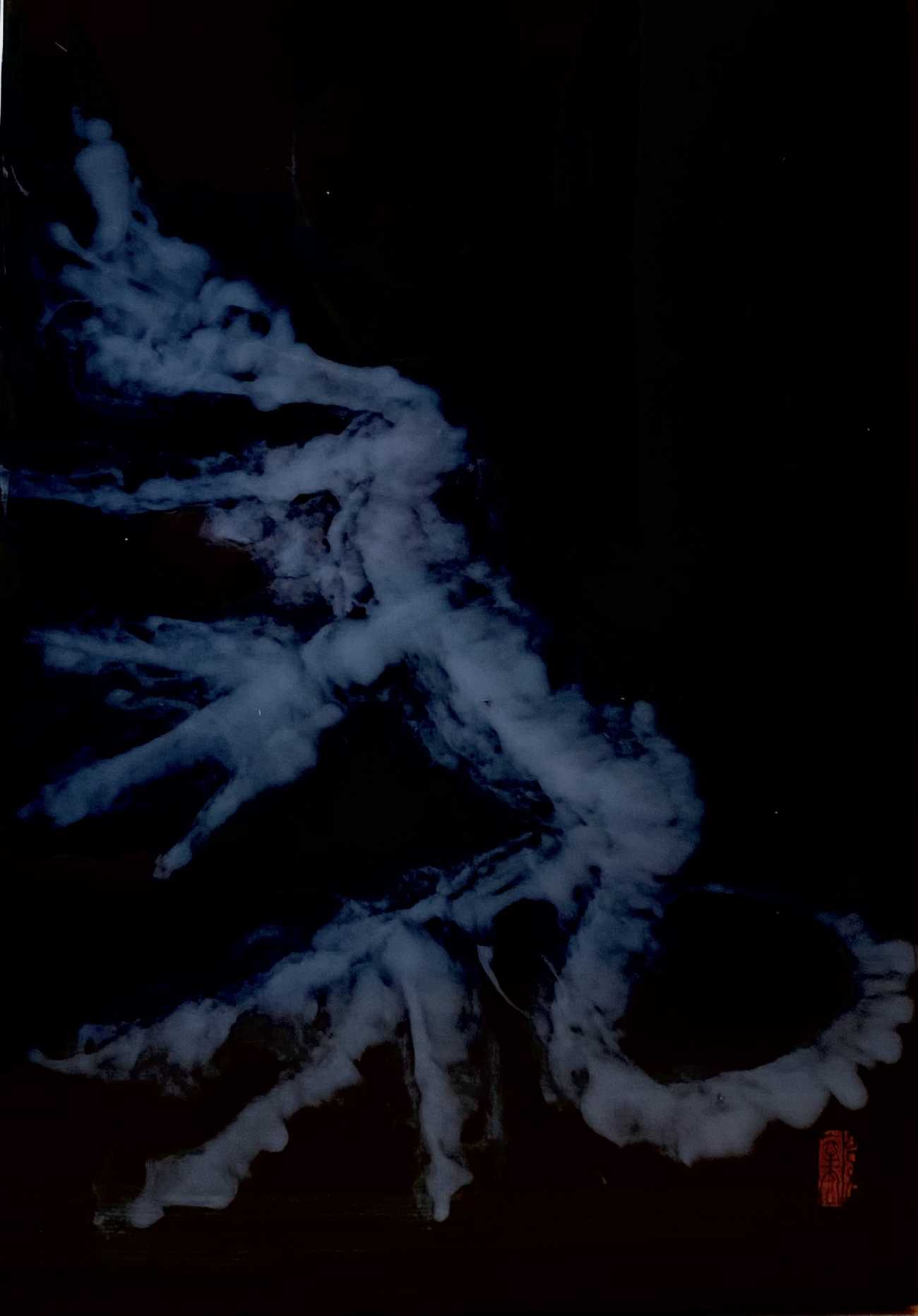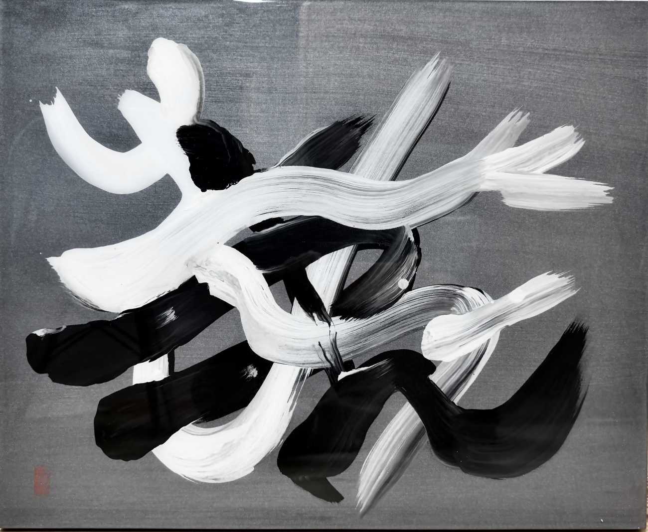 伝統的な龍虎図を字で表現することをテーマにした。陰陽と黒白、龍虎の対立と呼応の世界観を字で現代的に表現する試みである。墨と白墨によって生成された不定形の層は、陰陽という二項対立を固定的な象徴ではなく、揺らぎ続ける状態として提示する。その内部に現れる「龍」「虎」の文字は、書かれた形象ではなく、むしろ画面から切り抜かれた余白として機能し、背景との主従関係を反転させる。文字と地、黒と白、充填と欠如が相互に侵食し合う構造の中で、意味は解体され、視線の運動そのものが作品体験として立ち上がる。龍虎という相反する力の象徴を文字として内在化させ、視線より身体感覚で感応させ、書と絵画の境界を横断する表現を試みた。