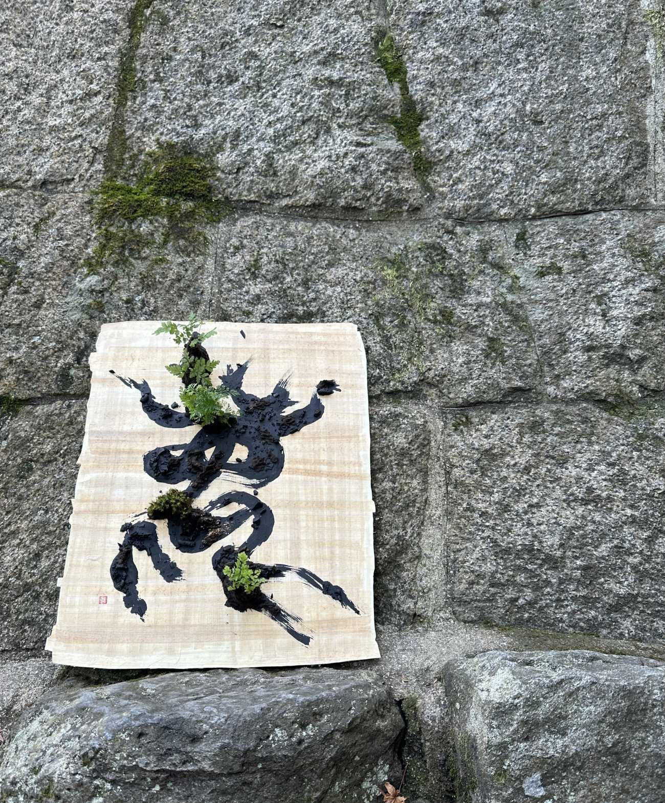 植物から生まれたパピルスに象形文字の「鹿」を書き、その上に植物を施した。朽ちたのち、また新たな何かが芽吹くことを想いながら