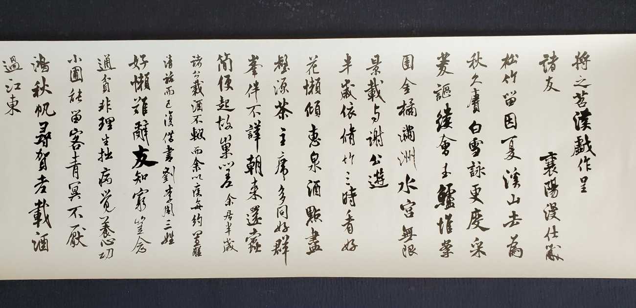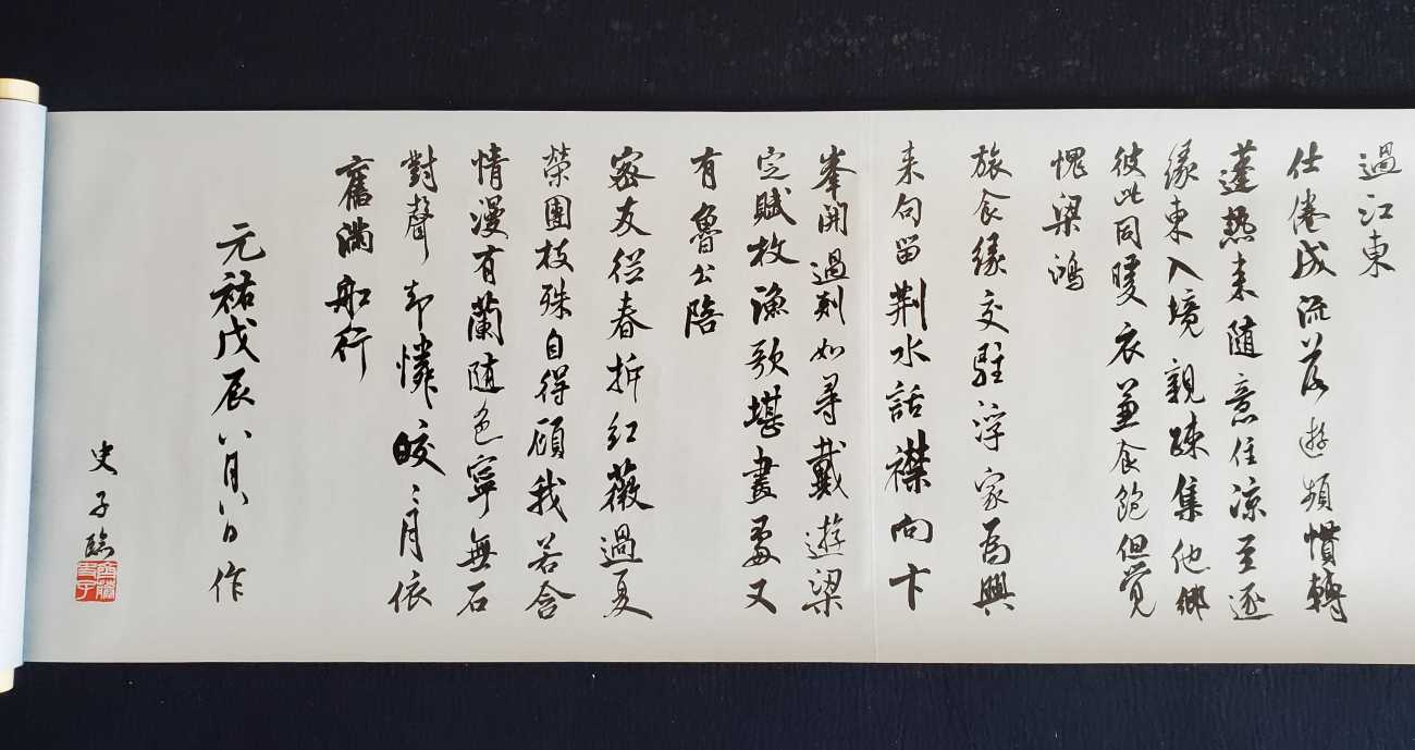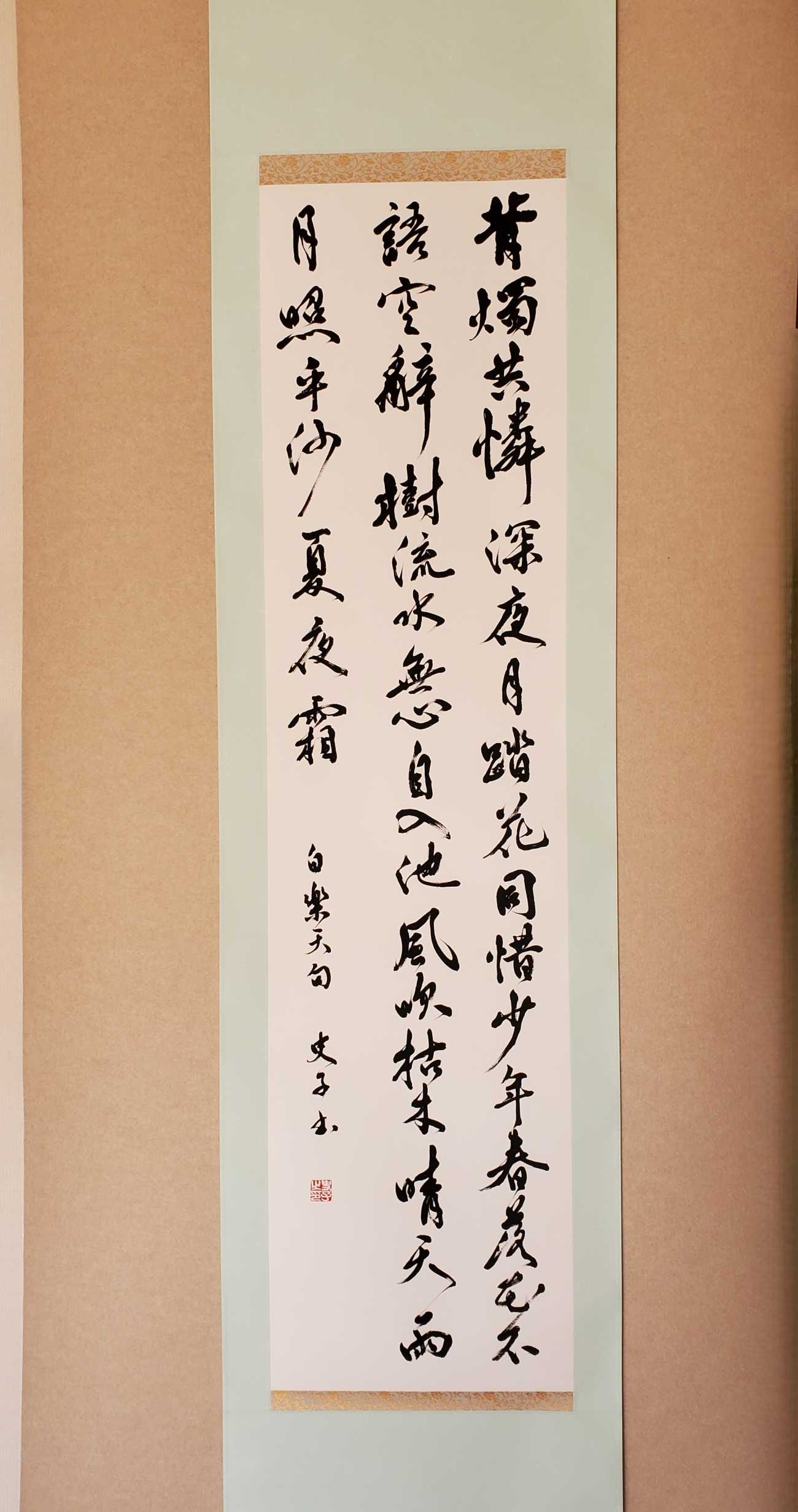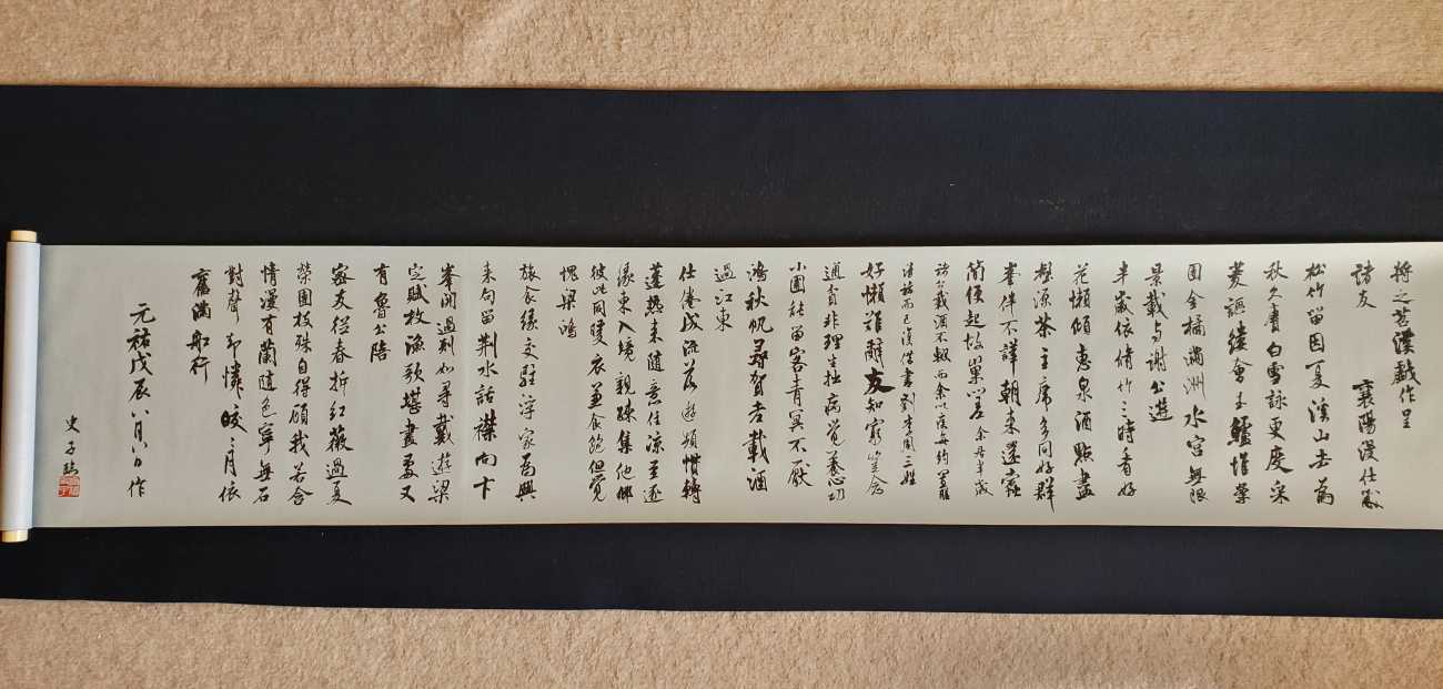 HOME 書画コース 米芾を追究 米芾を追究 書画コース 齋藤史子 作品サイズ:320×1360mm 用紙:周囲に黄色のボカシ入りの漢字用半切(両端をカット) 筆:兼毛筆4号 画像を拡大 CLOSE 大学での学びの集大成と考えて学びを振り返った際、卒業制作1で米芾の「苕溪詩巻」を臨書、またコミュニティーの臨書の会に参加し、王義之の「集字聖教序」を臨書したことからも王義之&米芾をテーマとして、作品制作に取り組みました。 王義之の「集王聖教序」を半切3行書きでも臨書したことから、3行書きの倣書に挑戦! 米芾「苕溪詩巻」原寸大臨書(全体) 米芾「苕溪詩巻」原寸大臨書(拡大1) 米芾「苕溪詩巻」原寸大臨書(拡大2) 米芾の「苕溪詩巻」を動画撮影してみました(youtube、初めての試み) Tag #書道 #伝統芸術 齋藤史子 書画コース Share Xでシェアする LINEでシェアする このコースのその他作品 書画コース 2025年度作品 作者井上 佳江子 書画コース 2025年度作品 作者吉村 佳代子 書画コース 2025年度作品 作者柘植真樹子 書画コース 2025年度作品 作者松崎礼子 書画コース 2025年度作品 作者鶴岡 玄光 書画コース 2025年度作品 作者豊永高子 書画コース 2025年度作品 作者横垣敬子 書画コース 2025年度作品 作者鈴木香子 書画コース 2025年度作品 作者吉田万由美 書画コース 2025年度作品 作者江口 亮子