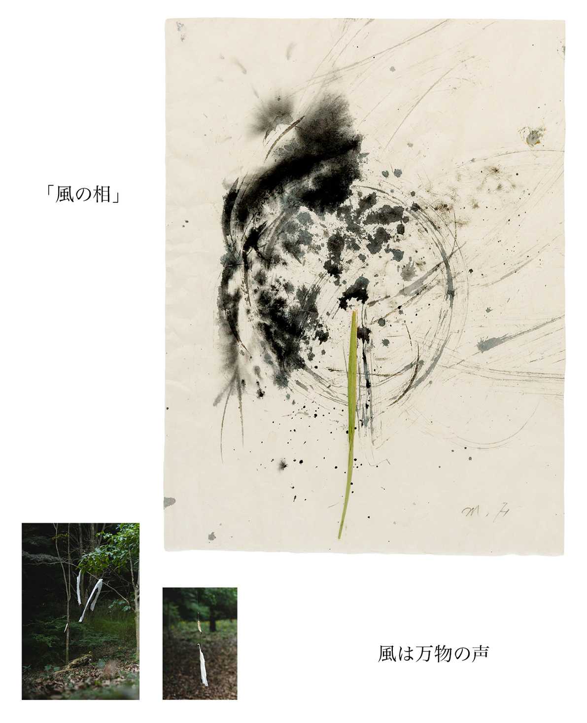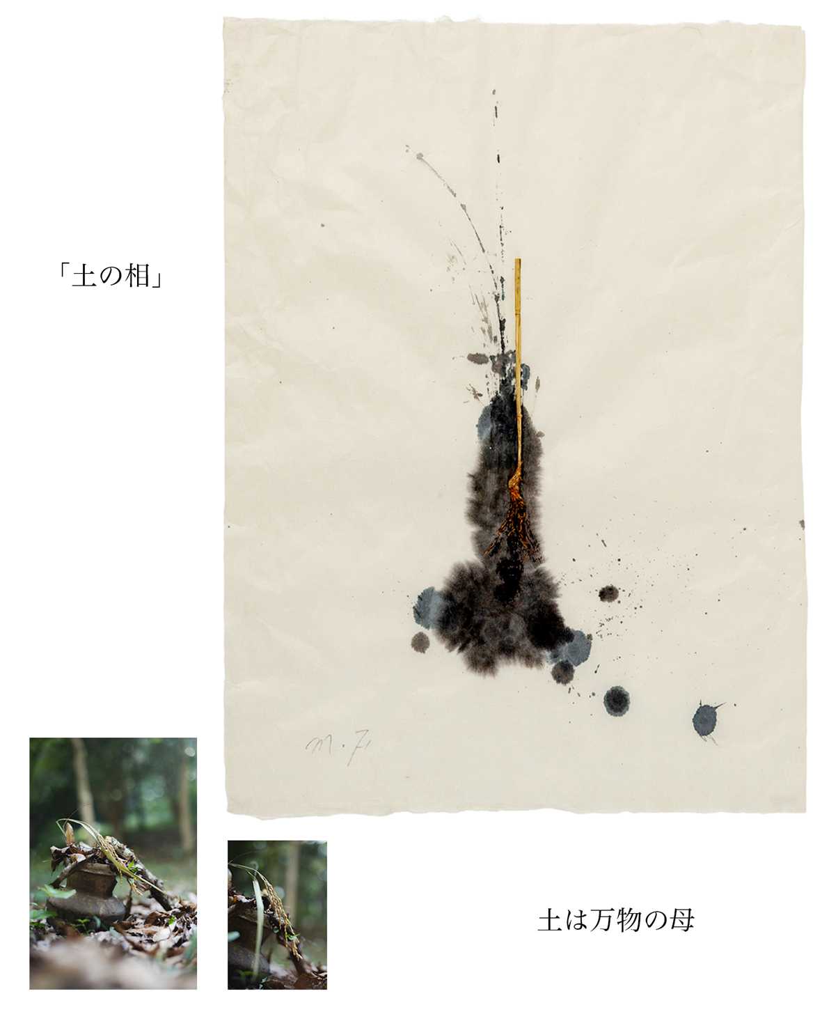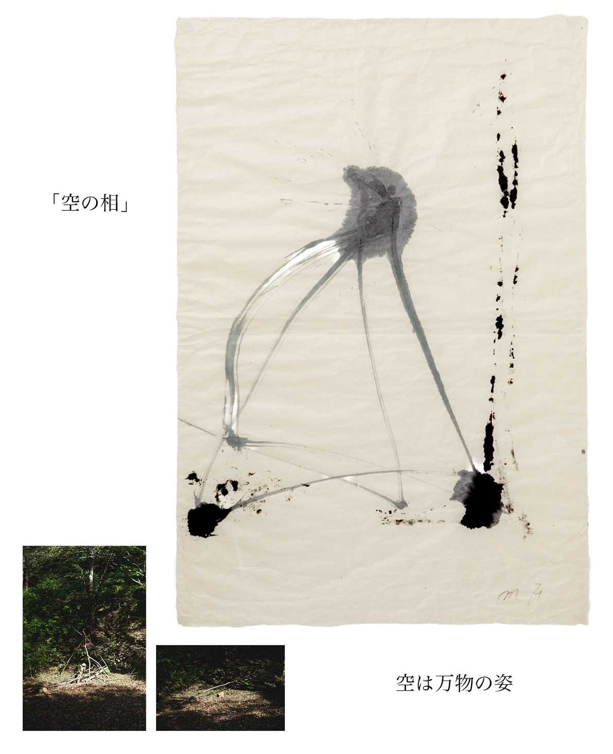 書画コースを学んでいる時に「花をたてる」「依代をたてる」という「たてる」という言葉に出会い、とても興味、関心を持ちました。「たてる」行為には神への畏敬、祈り、願いをなどが込められている事を知りました。そんな中で日本の永い歴史の中で、今もすたれることもなくこの「たてる」という行為が続いているのは、祈りや願いだけではない、それとは異なった理由があるのではないかという気持ちが湧いてきました。その自分の中の疑問を墨象作品(平面)と、墨象作品の中に潜む空気感を空間の中に構成した(屋外作品)、この二つの作品を通して、宇宙の5元素(地、水、火、風 空)を基に表現することで、解決し、自分なりの答えを探そうと試みました。
