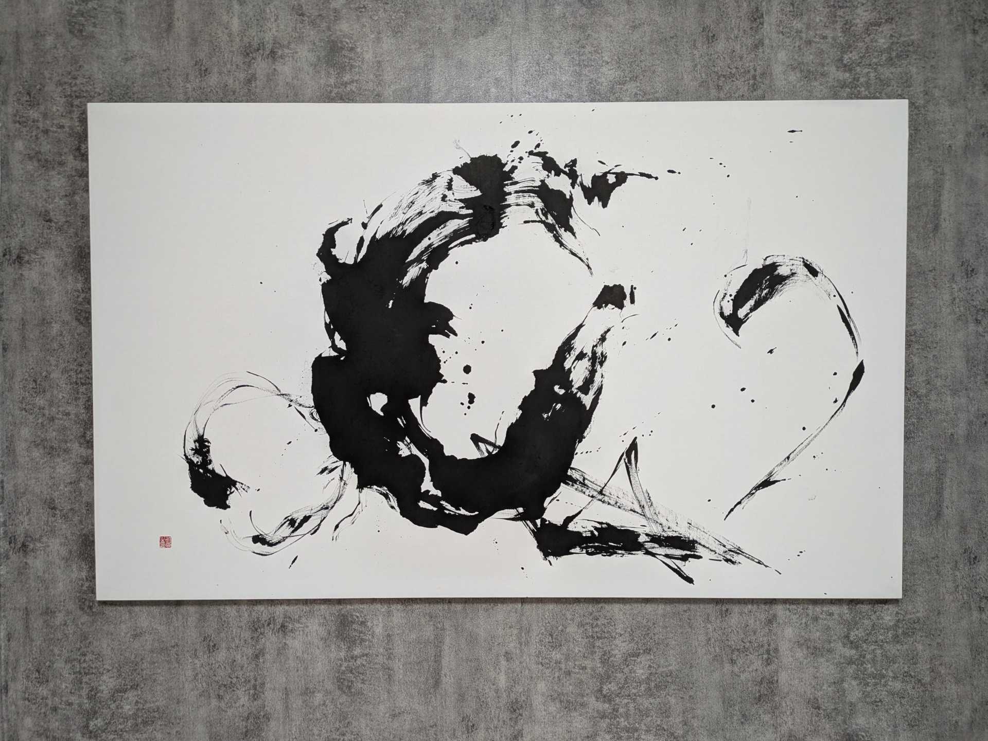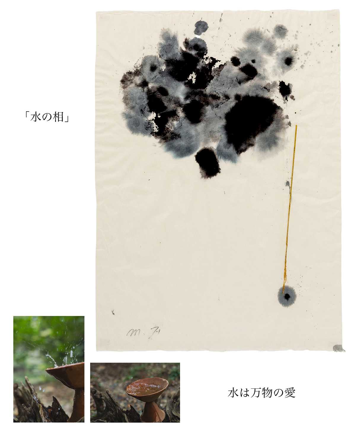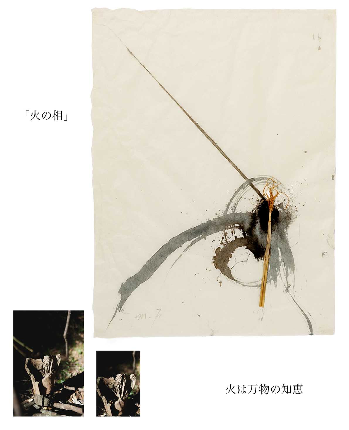 書画コースを学んでいる時に「花をたてる」「依代をたてる」という「たてる」という言葉に出会い、とても興味、関心を持ちました。「たてる」行為には神への畏敬、祈り、願いをなどが込められている事を知りました。そんな中で日本の永い歴史の中で、今もすたれることもなくこの「たてる」という行為が続いているのは、祈りや願いだけではない、それとは異なった理由があるのではないかという気持ちが湧いてきました。その自分の中の疑問を墨象作品(平面)と、墨象作品の中に潜む空気感を空間の中に構成した(屋外作品)、この二つの作品を通して、宇宙の5元素(地、水、火、風 空)を基に表現することで、解決し、自分なりの答えを探そうと試みました。