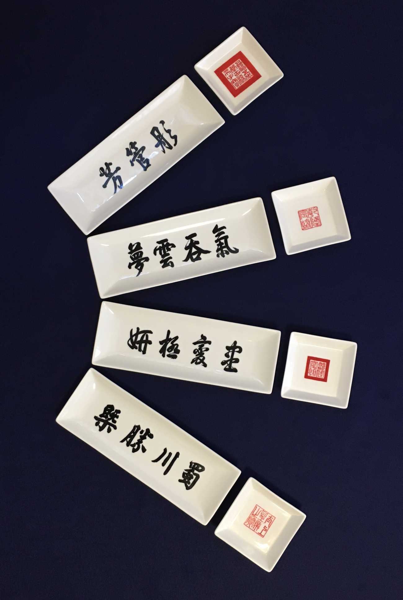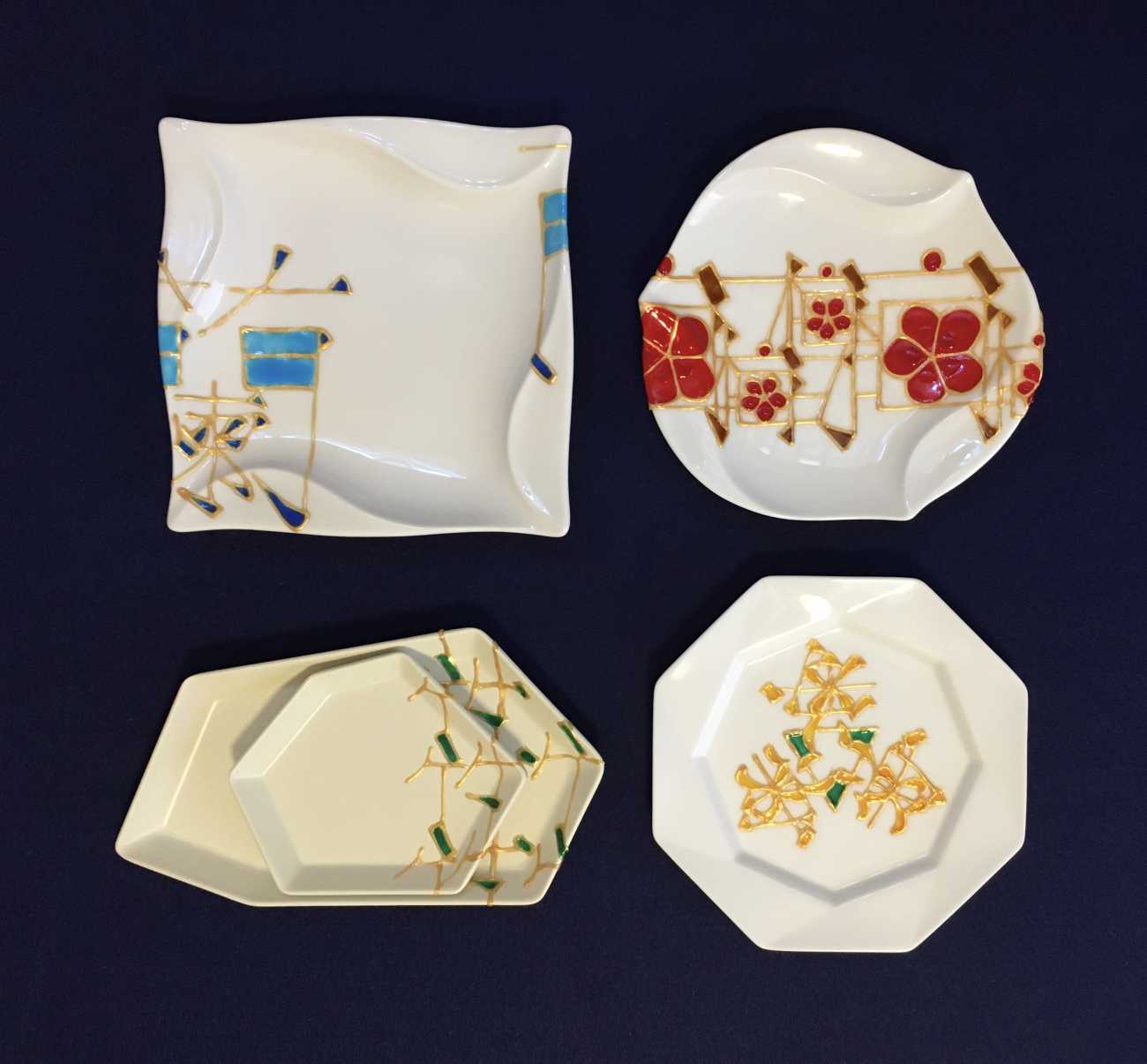 凸凹の皿には、漢字をステンドグラス用の絵の具でシール状に加工すれば、難なく定位置に収まる。「蘭→竹→菊→梅」の順にデザインの抽象度を段階的に高めながらも、瘦金体そのものが持つ独特の美しさを損なわないよう努めた。