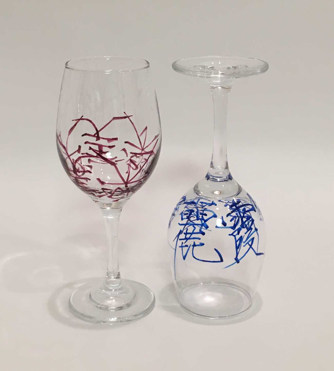書画 Ⅲ-1: 徽宗帝の痩金体千字文から創作、Ⅴ-1:乾隆帝の挿入題字と落款を皿に臨書、Ⅴ-2:徽宗帝・康熙帝・乾隆帝の書を比較、卒業制作1では徽宗帝の唯一の大字を臨書。卒業制作2では集大成として、乾隆帝と徽宗帝の書をデザイン領域で取り組む。①デザイン化した痩金体を凹凸皿に表現 ②乾隆四名巻の1つの挿入題名と落款を小皿に表現 ③痩金体をワイングラス25個に表現:ワイングラスの角度を変えると文字が幾重にも重なり植木鉢から森に変化する粗密が出現。ワイングラスの中を覗くと文字の表裏が異なる鏡文字となりアインシュタインのワームホールのよう。ワイングラスの中に小宇宙が出現し時空を折り返す、そんな感覚の数学的な美を痩金体が生み出す。臥遊があるのなら、ワイングラスの中に小宇宙を臥遊する感覚があっても不思議はない。私にとってこの感覚こそ書画最大の魅力である。