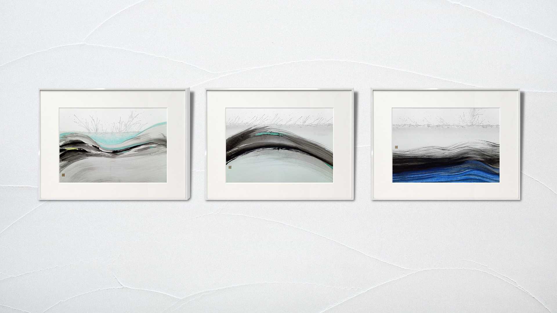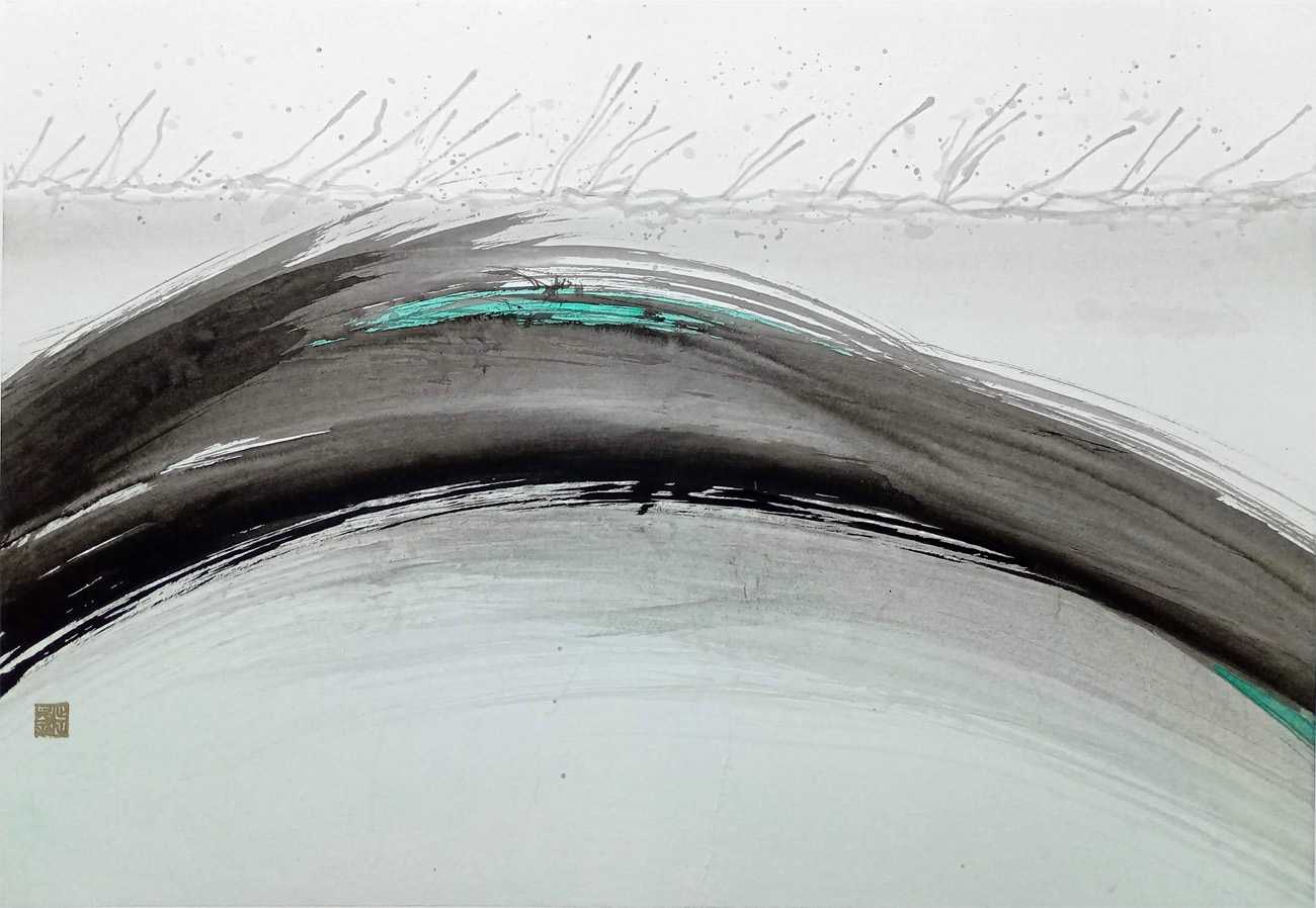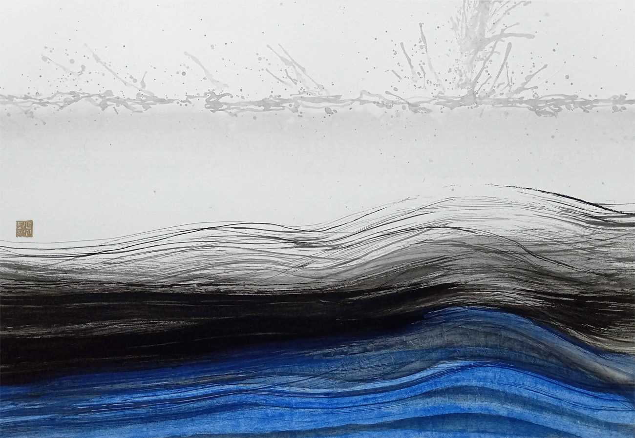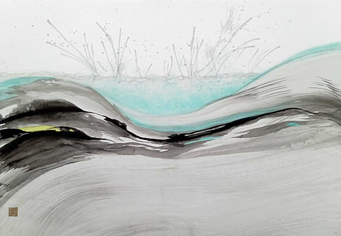 作品は、激つ・流れる・静まる(起承・転・結)の3部構成である。水のクリア感を出すために、淡墨がもつ透明感と繊細なグラデーションの魅力を信じて調整を行った。