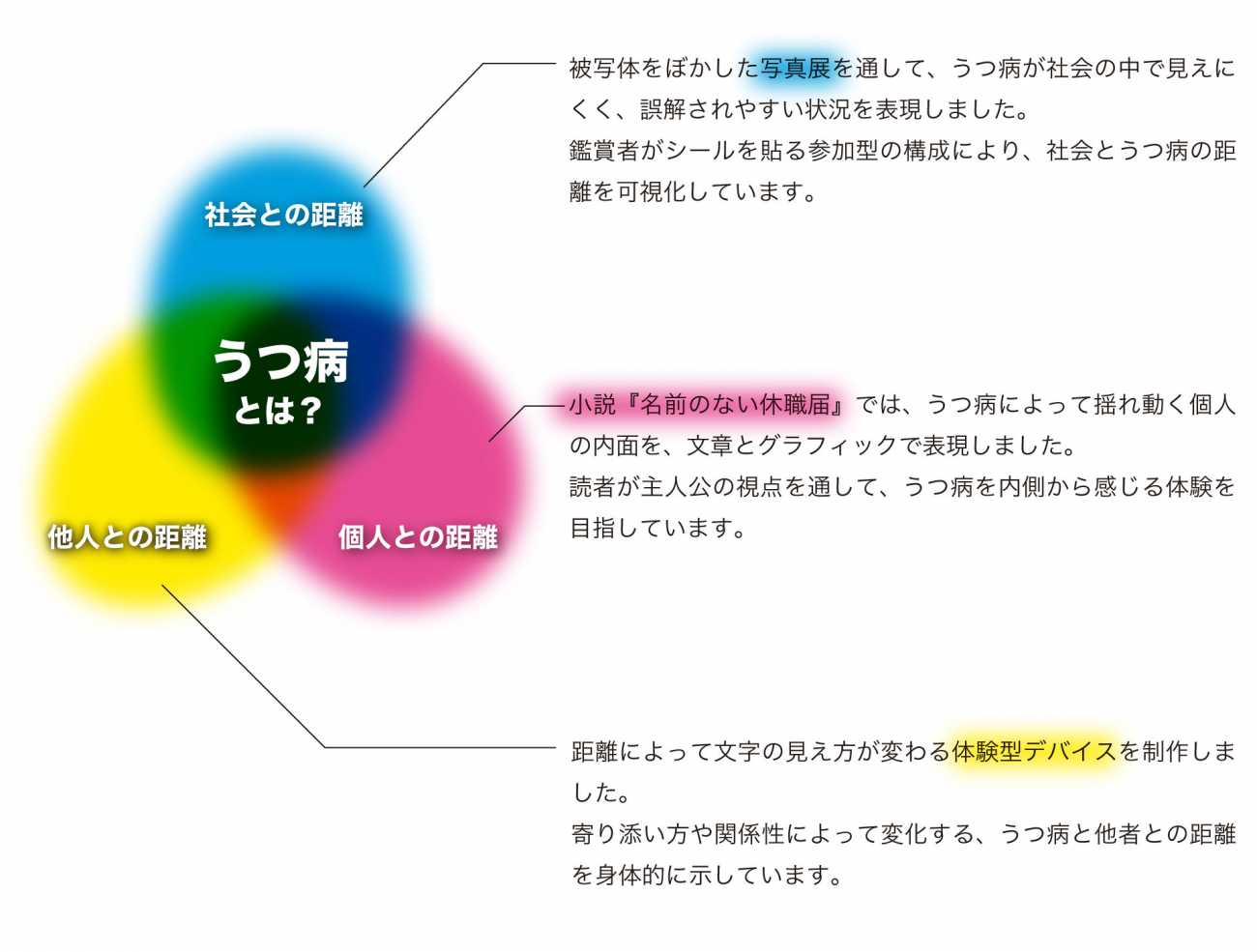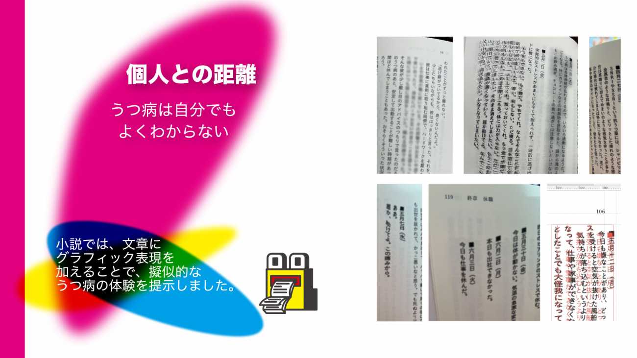 本卒業制作では、うつ病を一つの答えに収束させるのではなく、距離を変えて見てみることによって、その在り方を考えることを試みています。