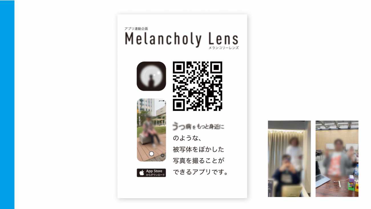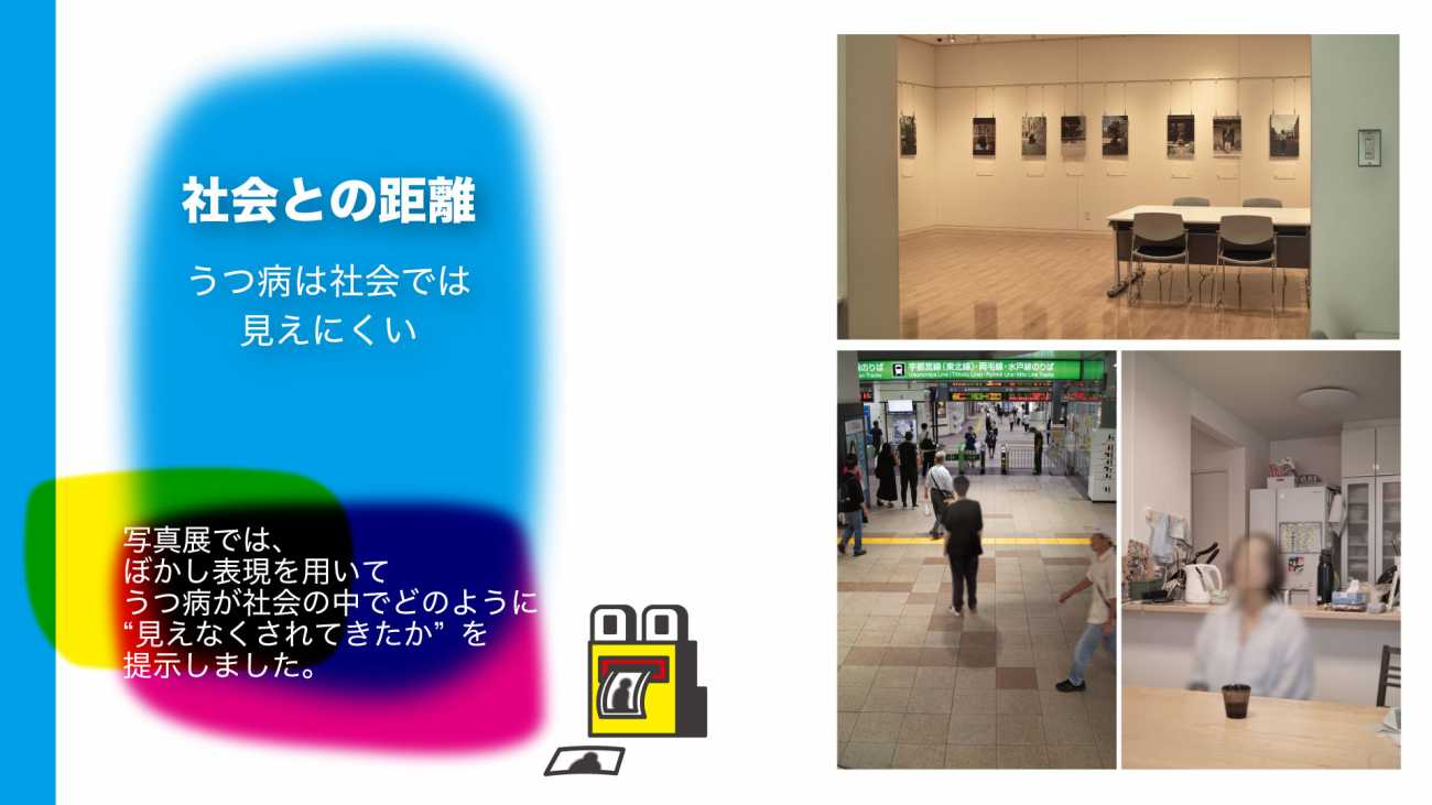 被写体をあえてぼかすことで、うつ病が社会の中で見えにくく、誤解されやすい現状を表現しています。「うつっぽい」シールを貼ることで、うつの見えにくさを体験できる展示としました。