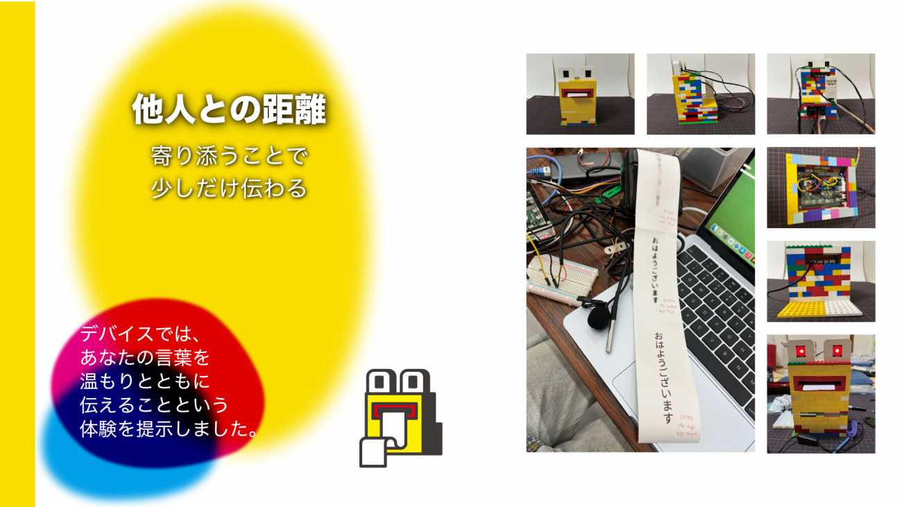 音声を入力すると文字が印字されますが、距離が離れていると文字はぼやけ、手で触れ温めることで徐々にはっきりと表示されます。これは、コミュニケーションには、寄り添う姿勢や関係性が大きく影響することを示しています。