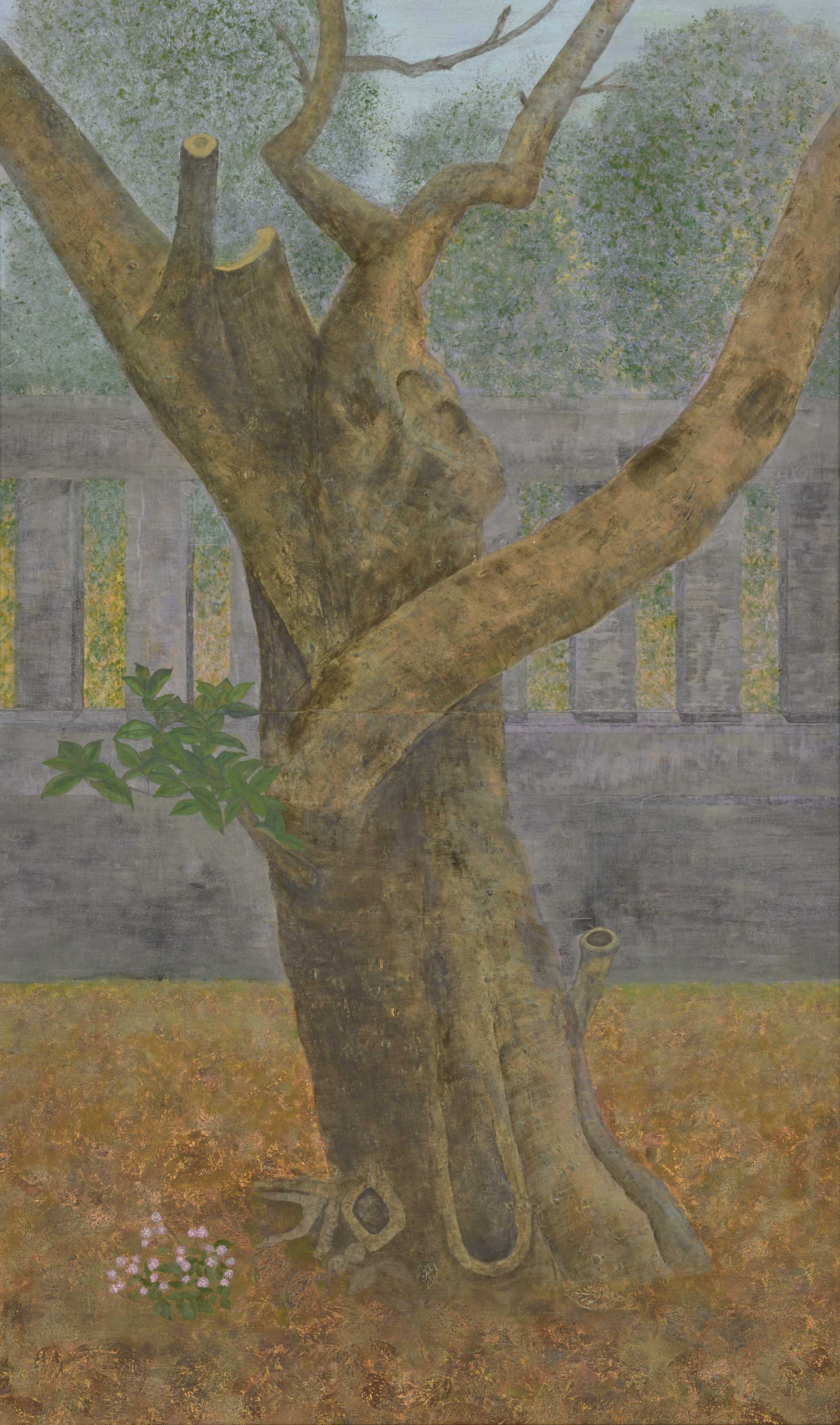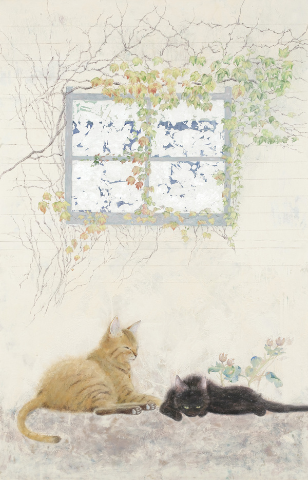 夏にスケッチをはじめて、あっという間に咲き誇って散っていく花のはかなさと、蓮独特のなまめかしさと、ちょっと生ぐさい感じを表現しようと思いました。つぼみから枯れるまでを縦長の画面におさめることで時間の流れと生命が生まれて消えるまでを描きたいと思って制作しました。