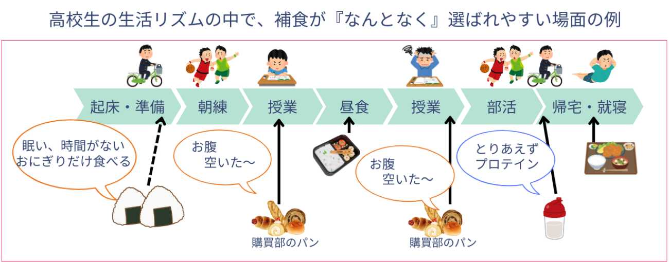 高校生の生活リズムの中で、補食が『なんとなく』選ばれやすい場面の例